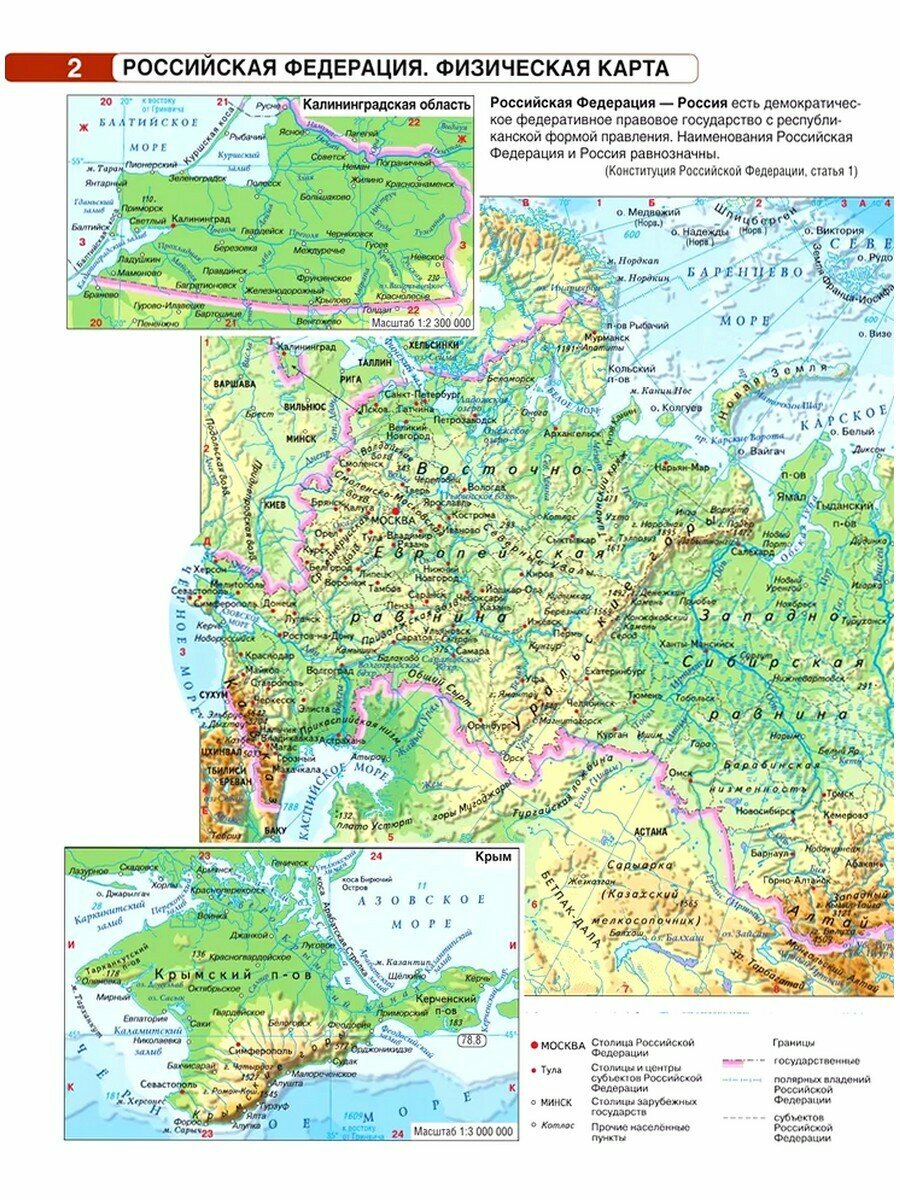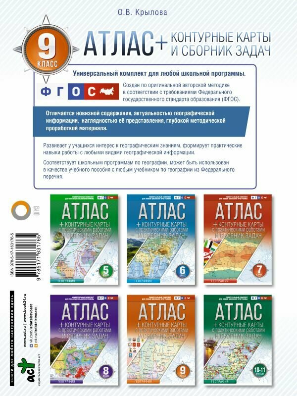 Универсальный учебно-методический комплект по географии для 9-го класса (автор – О.В. Крылова) состоит из атласа, контурных карт с практическими работами и сборника задач по работе с атласом. Комплект разработан в соответствии с "Концепцией развития географического образования в Российской Федерации" и направлен на формирование знаний о географическом, природном, культурном, этнографическом и социально-экономическом разнообразии России. Многочисленные и разнообразные задания, представленные в "Сборнике задач" и на контурных картах, способствуют формированию географической культуры обучающихся, осознанию своей принадлежности к стране и своей "малой" Родине. Творческие и исследовательские работы, предложенные в УМК, развивают понимание обучающимися особенностей природы, населения и хозяйства России. Предложенные задания способствуют овладению учащимися универсальными учебными действиями в соответствии с требования ФГОС. Предлагаемый комплект подходит ко всем школьным программам и учебникам по географии, соответствует требованиям ФГОС и одобрен методистами. Россия в атласе представлена в новых границах: с Донецкой и Луганской народными республиками, Запорожской и Херсонской областями, Республикой Крым и Севастополем.