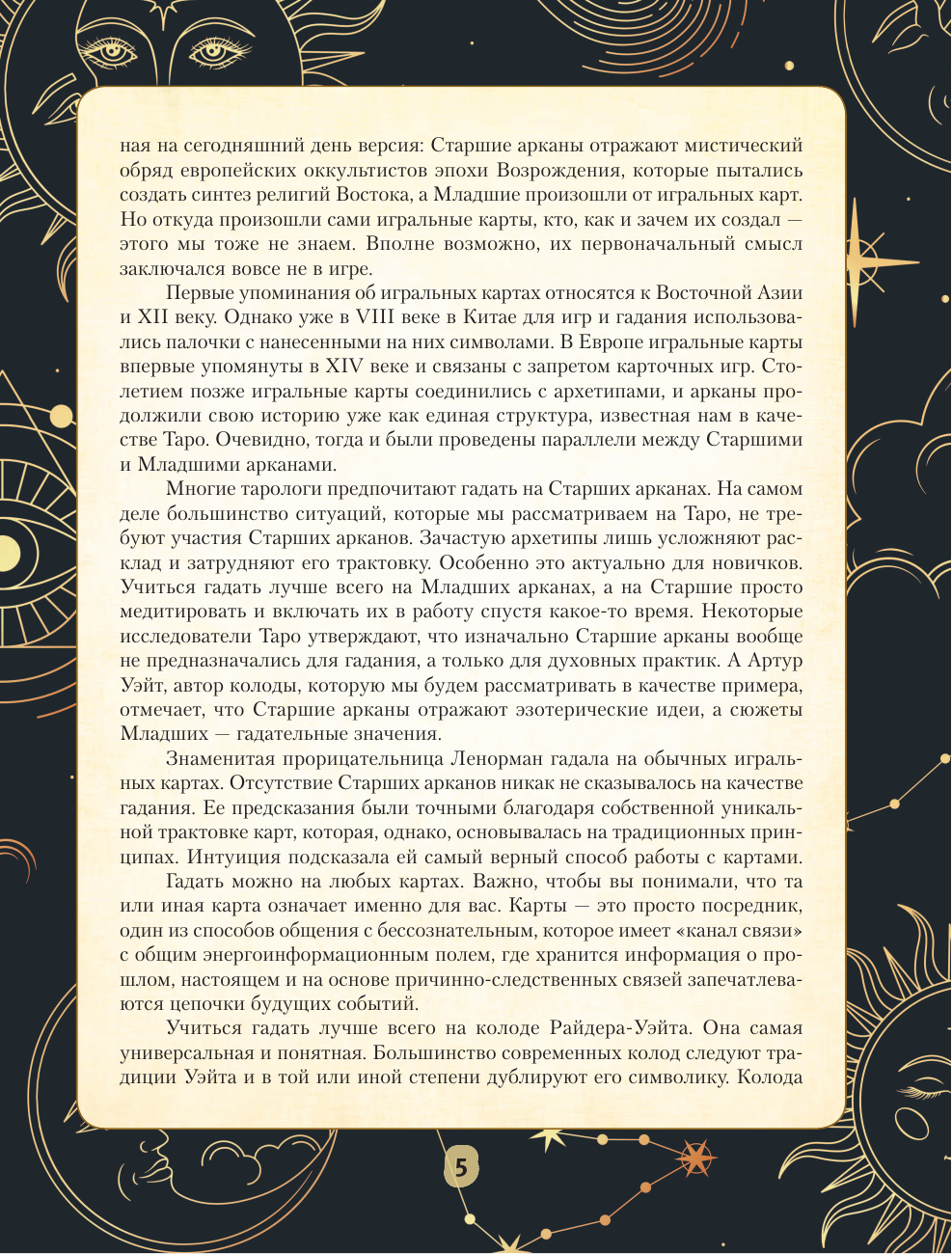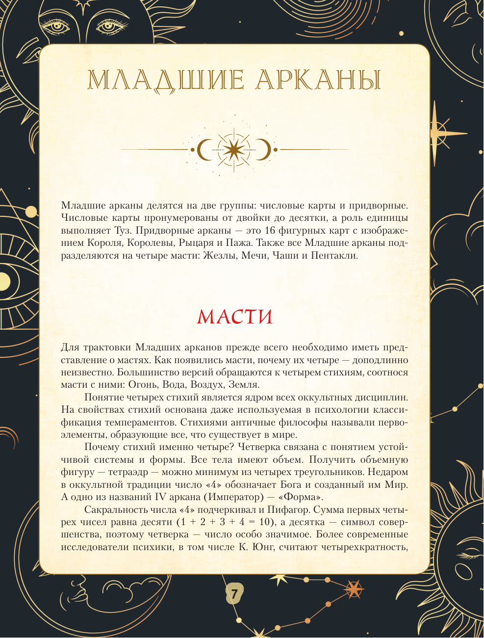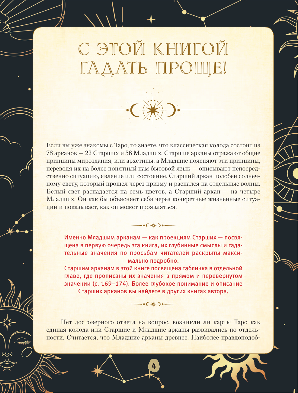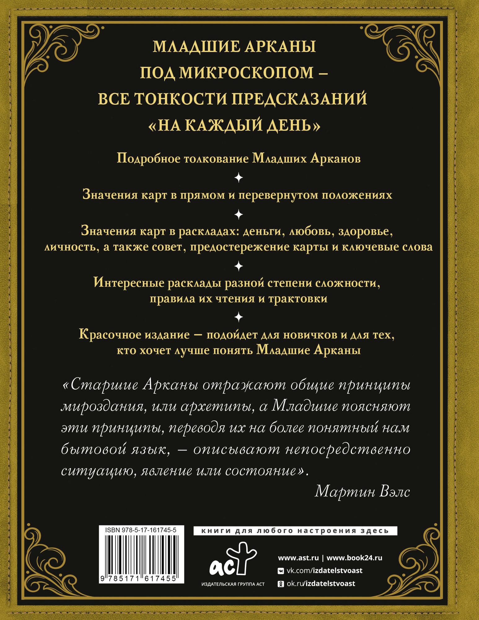 Новая книга Мартина Вэлса, признанного Мастера Таро с многолетним опытом, написана по просьбам читателей и посвящена именно Младшим Арканам, которые отражают житейские ситуации, кратковременные состояния и влияние окружающего мира на нашу жизнь. Здесь они раскрыты максимально подробно. Из этой книги вы узнаете: смысловое толкование Младших Арканов, значения карт в прямых и перевернутых положениях, а также в различных раскладах (на деньги, на любовь, на здоровье, на личность), кроме того, получите совет и предостережение карты. В книге подробно разбирается символика изображений и даны интересные расклады разной степени сложности, правила их чтения и трактовки. Новичок вы или уже имеете опыт работы с Таро, эта книга станет отличной отправной точкой для знакомства с миром Младших Арканов. Вы научитесь говорить с Вселенной через карты и разберетесь, как использовать Таро не только для улучшения своей любовной, рабочей и духовной жизни, но и для решения бытовых, повседневных вопросов. Информация о Старших Арканах представлена в книге в виде сводной таблицы. Подробное описание Старшей колоды можно найти в других книгах Мастера.