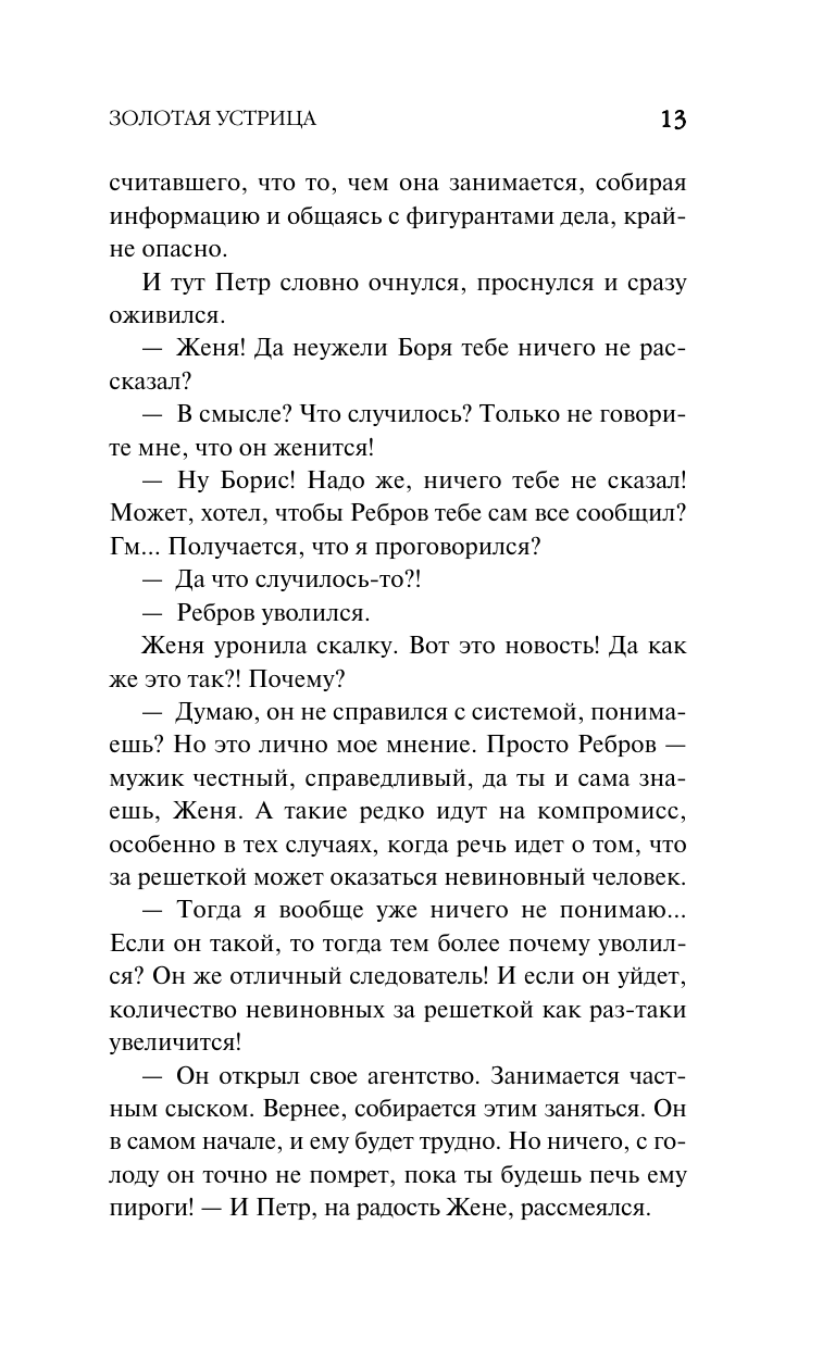 Бывший следователь Ребров, друг Жени Бронниковой, открывает свое детективное агентство. К нему обращается первый клиент: он потерял свою возлюбленную, Нину Коротич, которая исчезла при загадочных обстоятельствах. Женя не может остаться в стороне и принимается за поиски, и они приводят ее в дорогой коттеджный поселок на Рублевке, где творится что-то неладное. Женя выясняет, что до своего исчезновения пропавшая рассказывала друзьям о таинственной "Золотой устрице"...