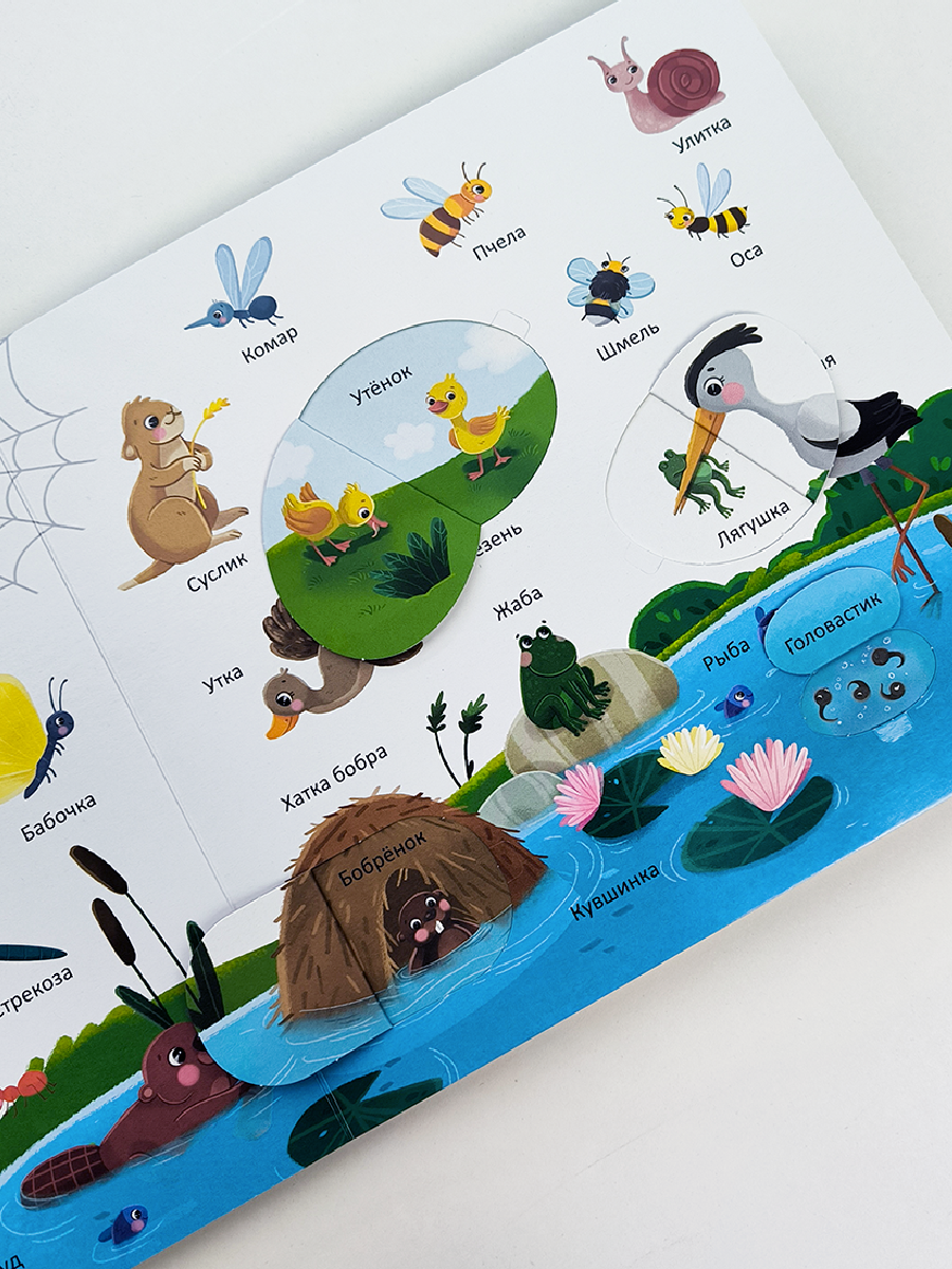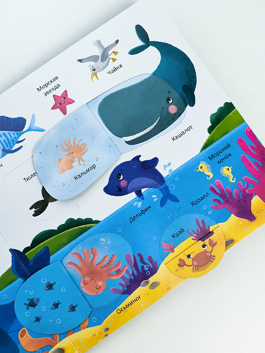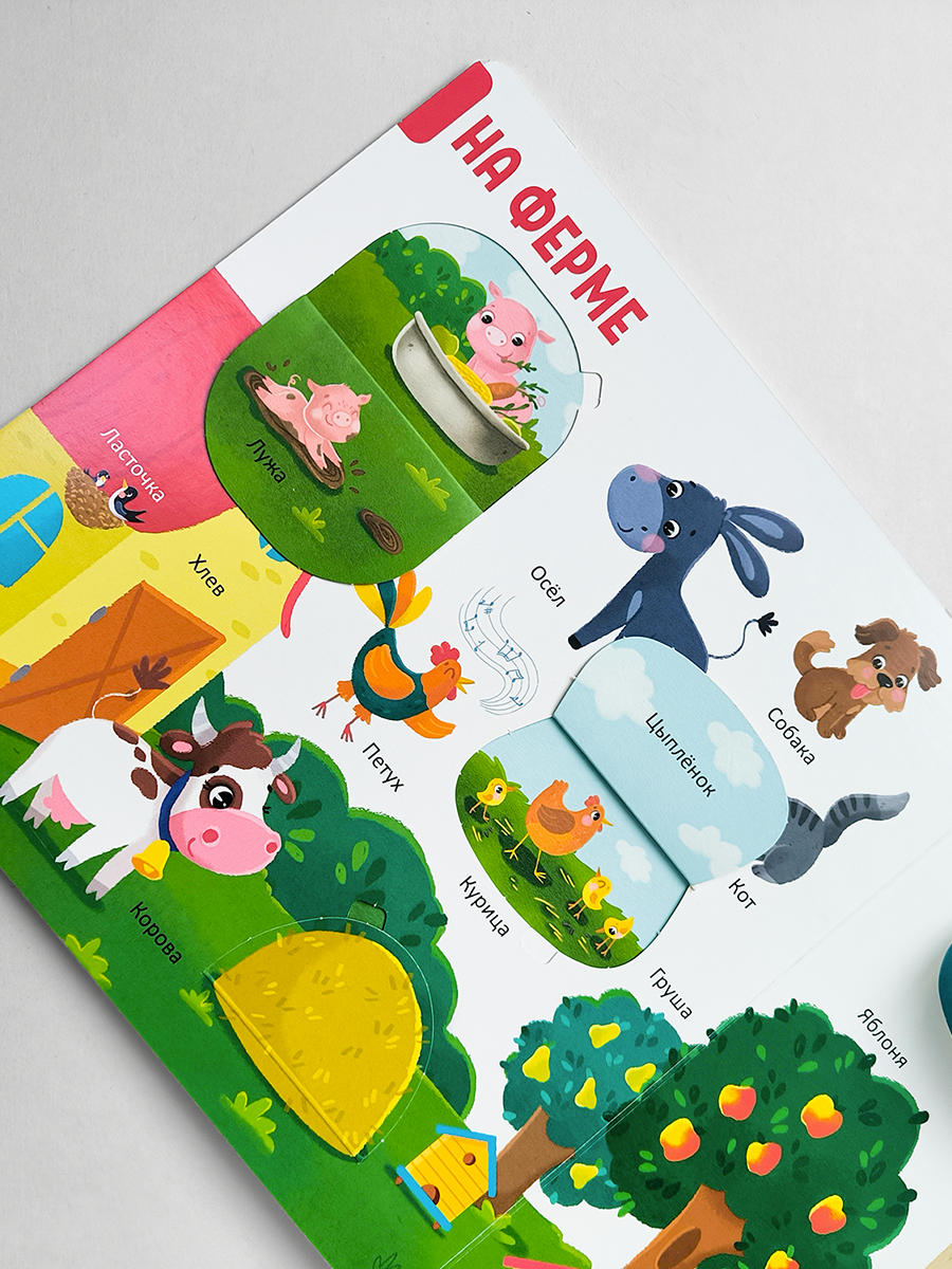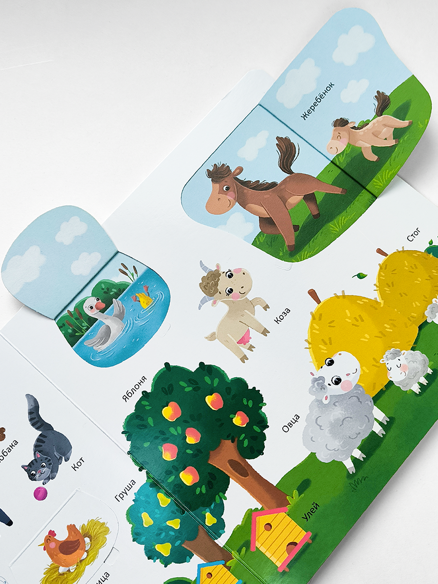 Красочные иллюстрации и интересные окошки помогут запомнить слова и превратят обучение в весёлую игру. А плотные картонные странички и большой формат позволят малышу с комфортом листать и изучать книгу самостоятельно, вовлекая его в процесс.