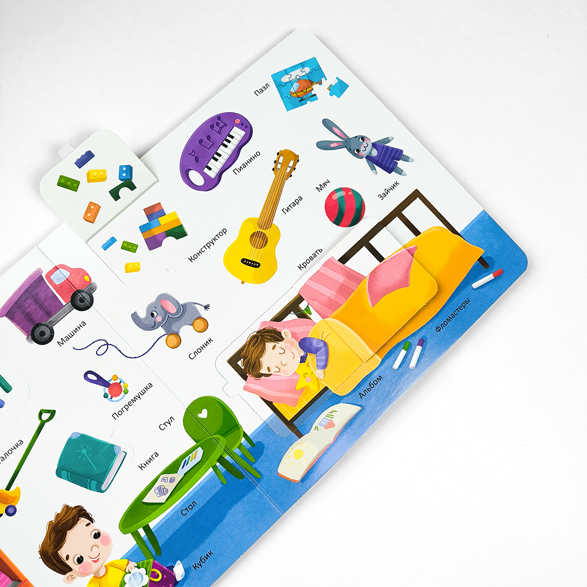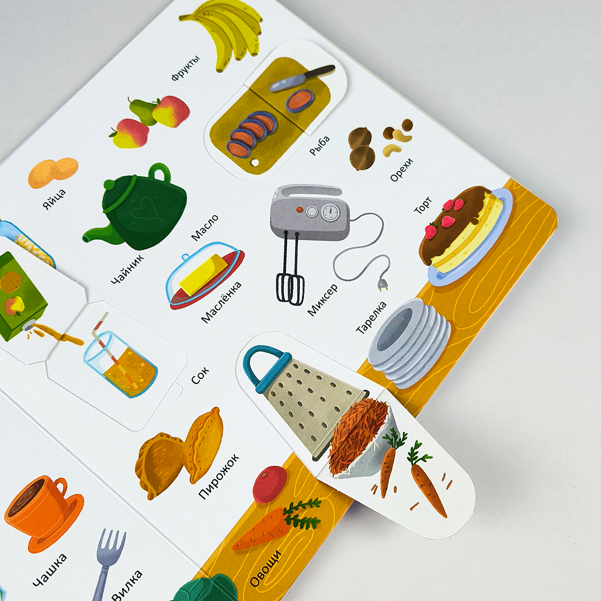 Красочные иллюстрации и интересные окошки помогут запомнить слова и превратят обучение в весёлую игру. А плотные картонные странички и большой формат позволят малышу с комфортом листать и изучать книгу самостоятельно, вовлекая его в процесс.