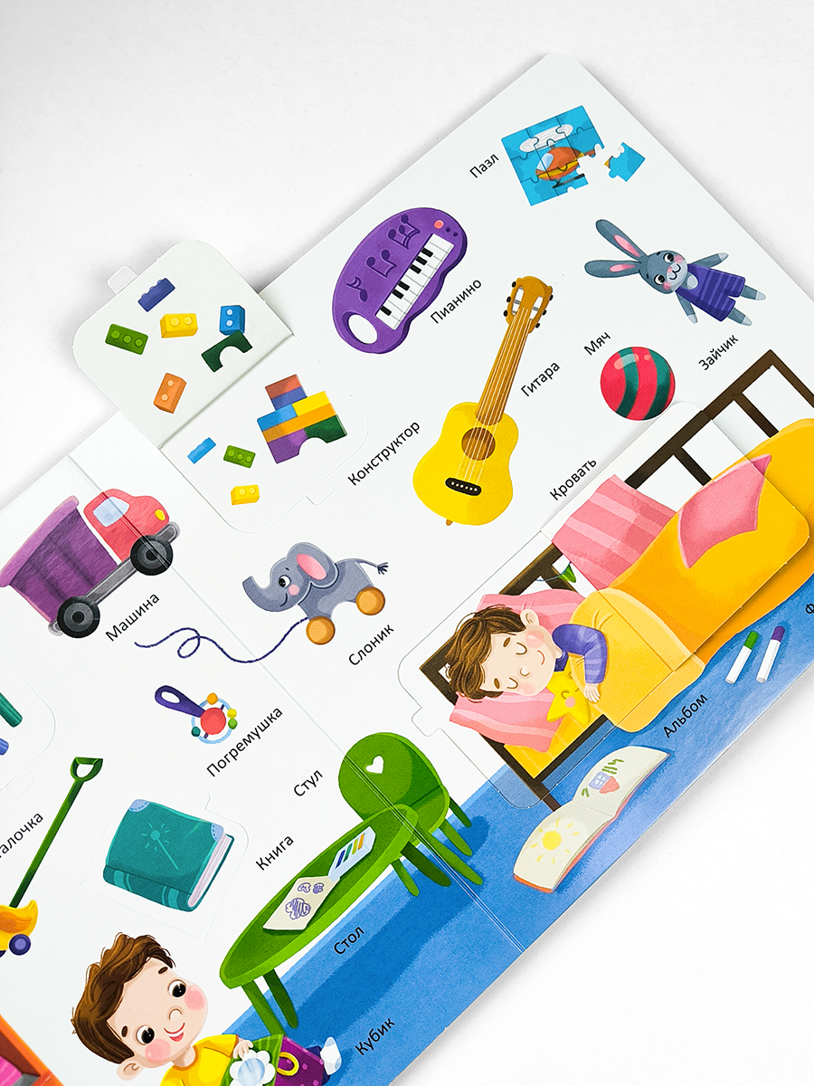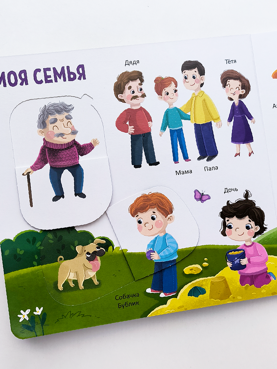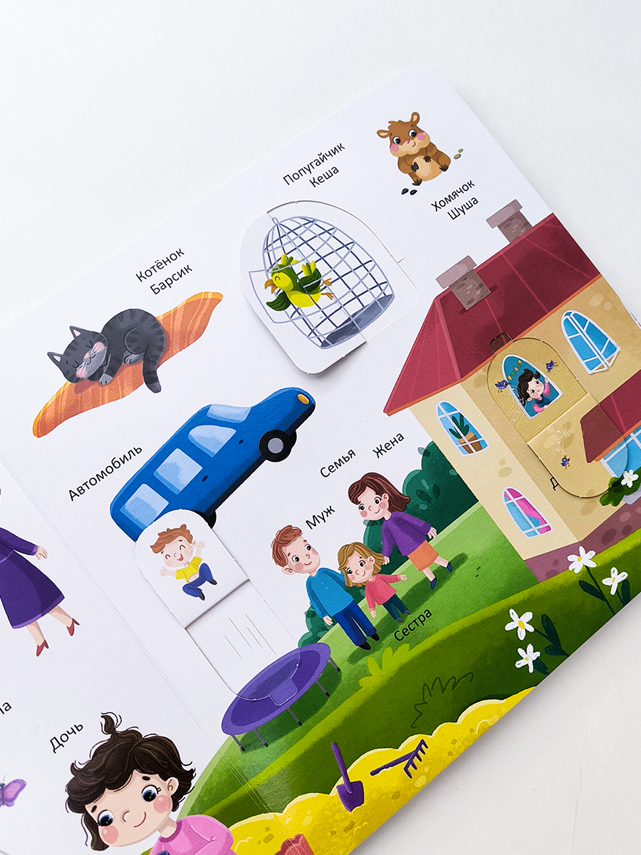 Красочные иллюстрации и интересные окошки помогут запомнить слова и превратят обучение в весёлую игру. А плотные картонные странички и большой формат позволят малышу с комфортом листать и изучать книгу самостоятельно, вовлекая его в процесс.