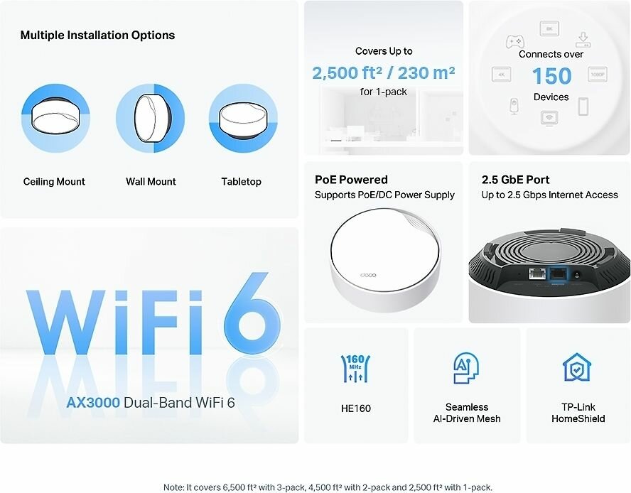 | Дополнительная информация | Deco X50-PoE - система Mesh Wi?Fi 6 класса AX3000 с поддержкой PoE со скоростью передачи до 574 Мбит/с на 2,4 ГГц и до 2402 Мбит/с на 5 ГГц. Использование Wi-Fi 6 в Mesh-системе позволяет получить прирост к площади покрытия, скорости и количеству одновременно подключённых устройств.,Технология модуляции 1024-QAM обеспечит скорость подключения до 3 Гбит/с, которой будет достаточно для выполнения ресурсоёмких задач, таких как облачный гейминг и просмотр потоковых видео 8К — наслаждайтесь онлайн-трансляциями с безупречным качеством изображения и звука без буферизации.,Благодаря поддержке PoE устройство Deco X50-PoE способно получать питание и обмениваться данными по одному кабелю Ethernet. Также возможно стандартное подключение к электросети (адаптер питания идёт в комплекте).,Модули Deco взаимодействуют друг с другом и образуют единую Mesh-сеть, которая обеспечит стабильный Wi-Fi в каждой комнате. Нужно увеличить площадь покрытия? Просто добавьте ещё один модуль Deco. |