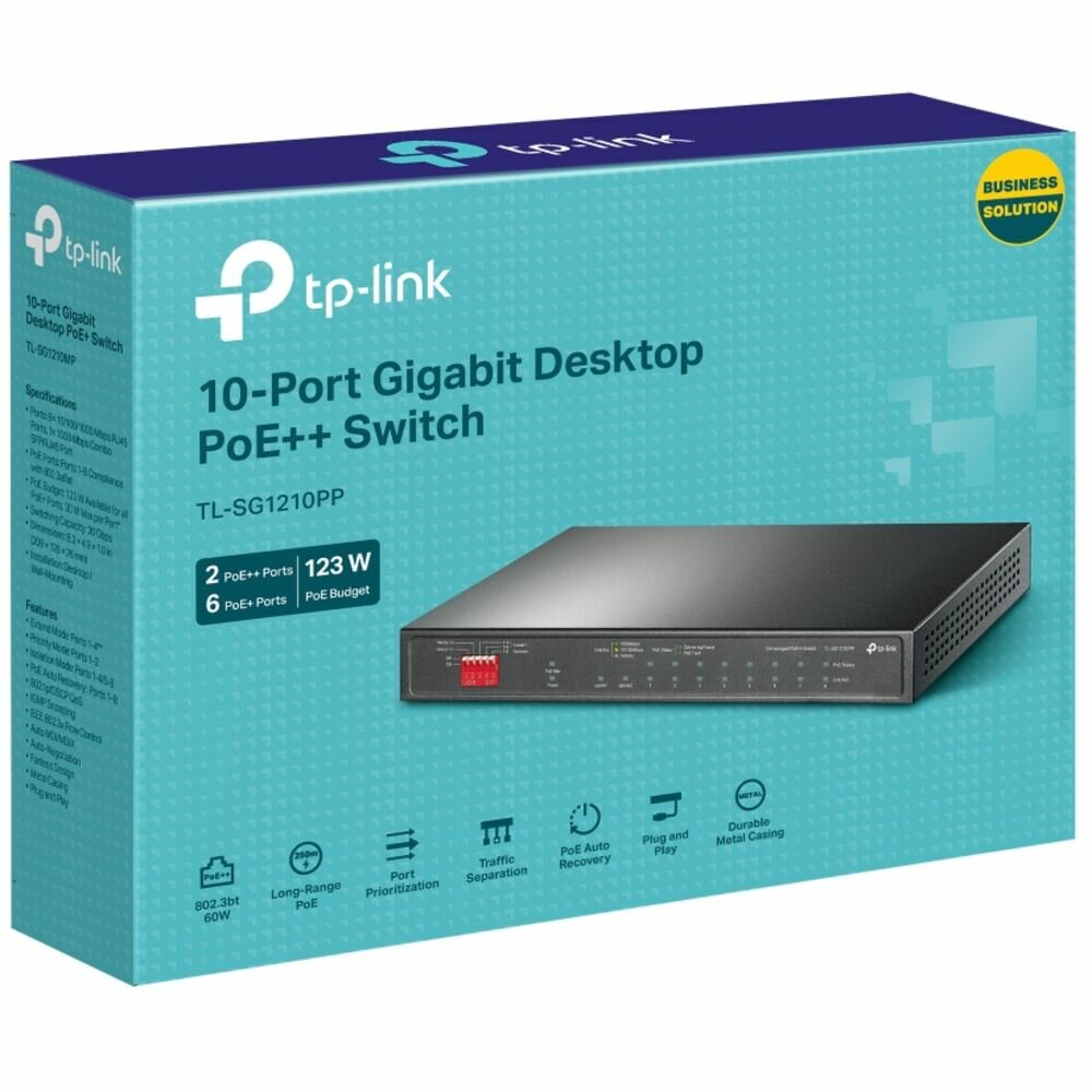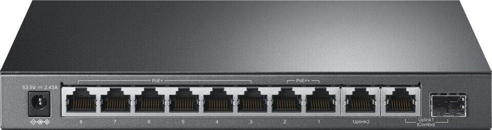 Коммутатор TP-LINK настольный с 9 гигабитными портами (6 портов PoE+ 2 порта PoE++) и комбинированным гигабитным портом RJ45/SFP TL-SG1210PP