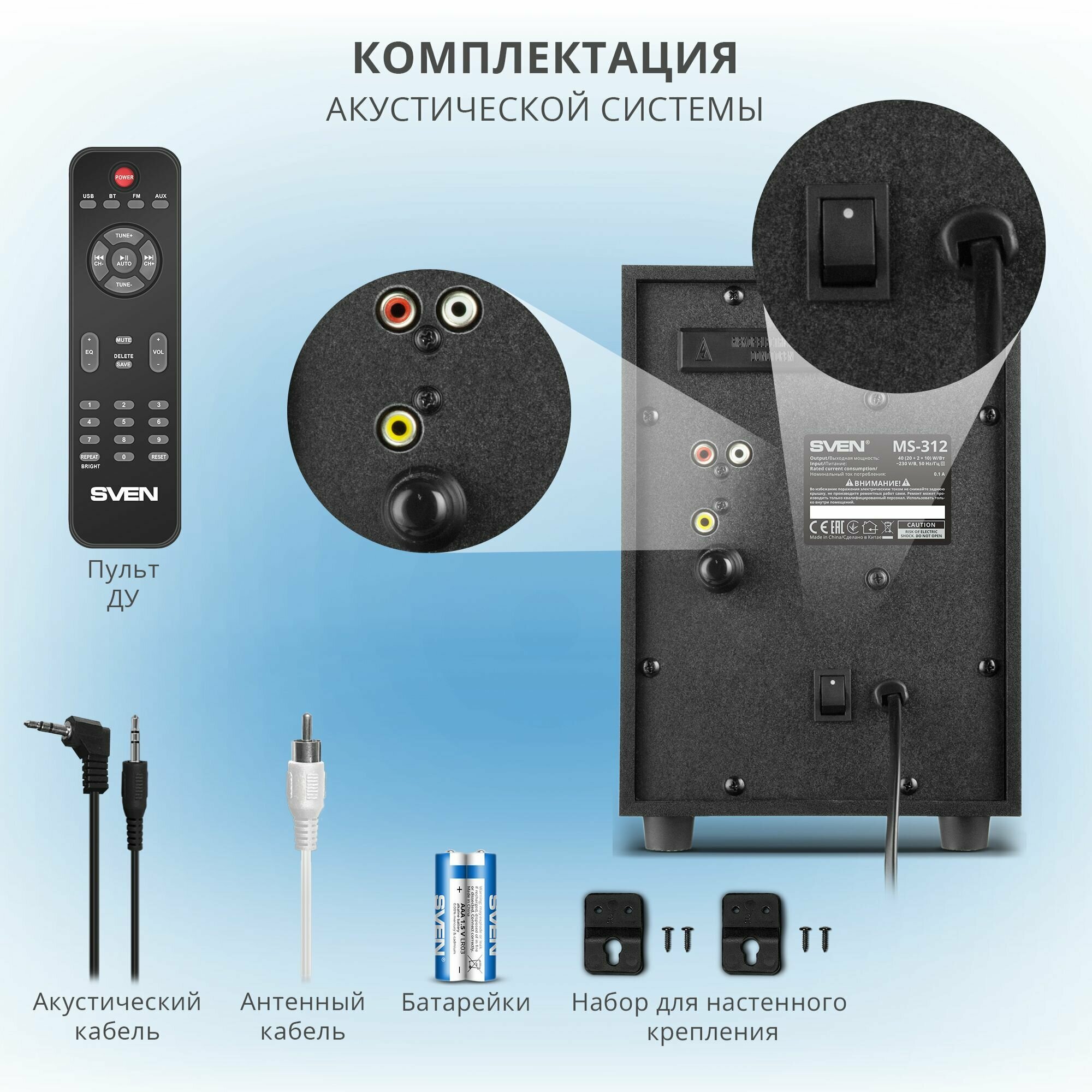 Может работать SVEN MS-312 и в автономном режиме. Во-первых, встроенный плеер способен воспроизводить аудиофайлы с USB-накопителей и карт памяти, что позволяет всегда держать нужные треки под рукой. А во-вторых, у владельцев комплекта есть возможность оказаться на волнах любимой радиостанции благодаря FM-приемнику.