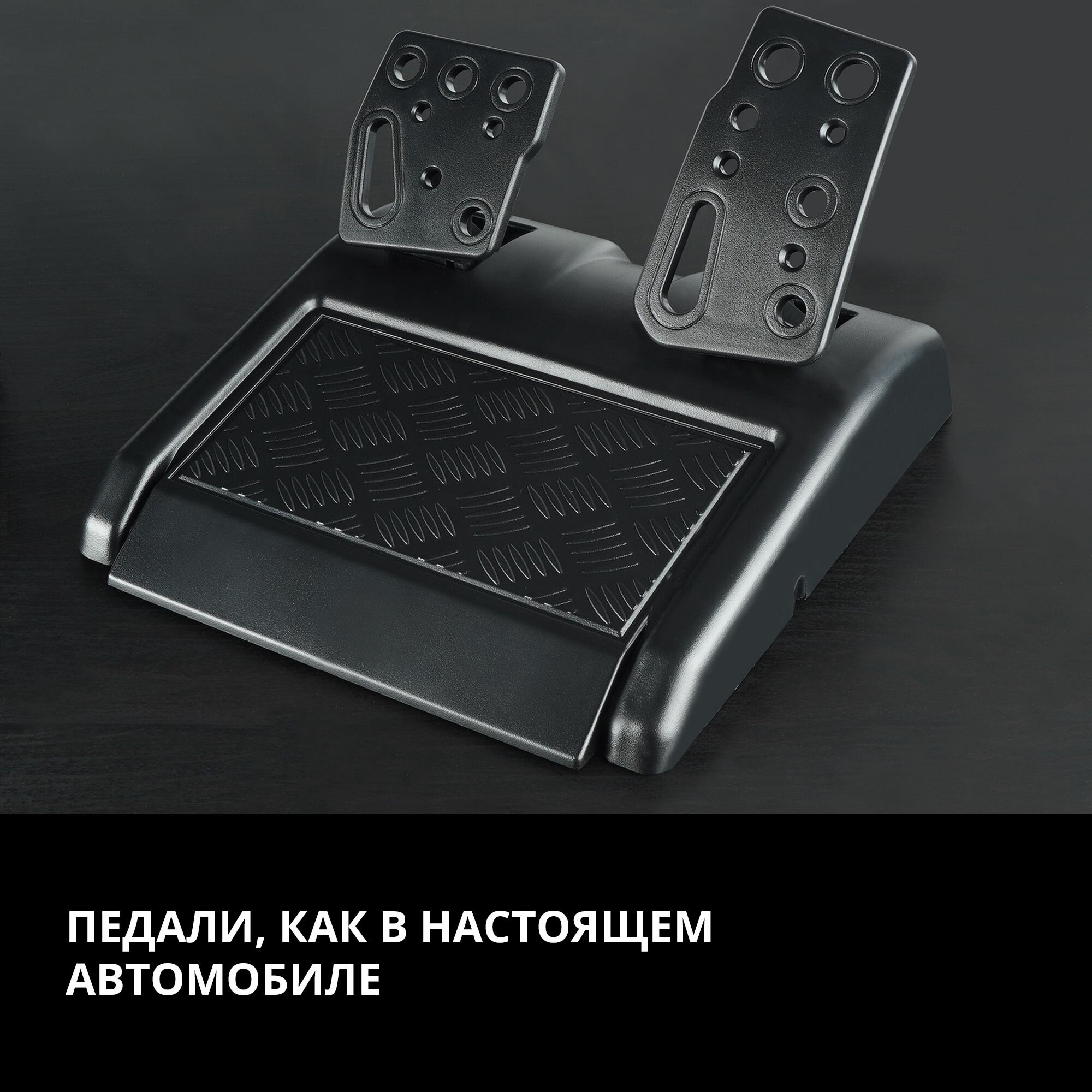 Управление автомобилем невозможно представить без использования педалей. В этом руле они размещены на специальной подставке, устойчиво стоящей на любых напольных покрытиях. Нажатие происходит с приятным усилием и максимально симулирует вождение авто.