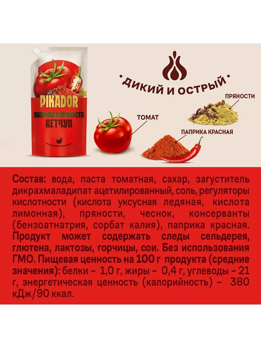 Кетчуп Pikador Паприка и пряности - это сочетание сочных томатов, пикантной паприки и ароматных специй. Он отличается насыщенным и пряным вкусом с легкой остротой. Кетчуп PIKADOR Паприка и пряности станет отличным дополнением к вашему столу и придаст блюдам неповторимый вкус.