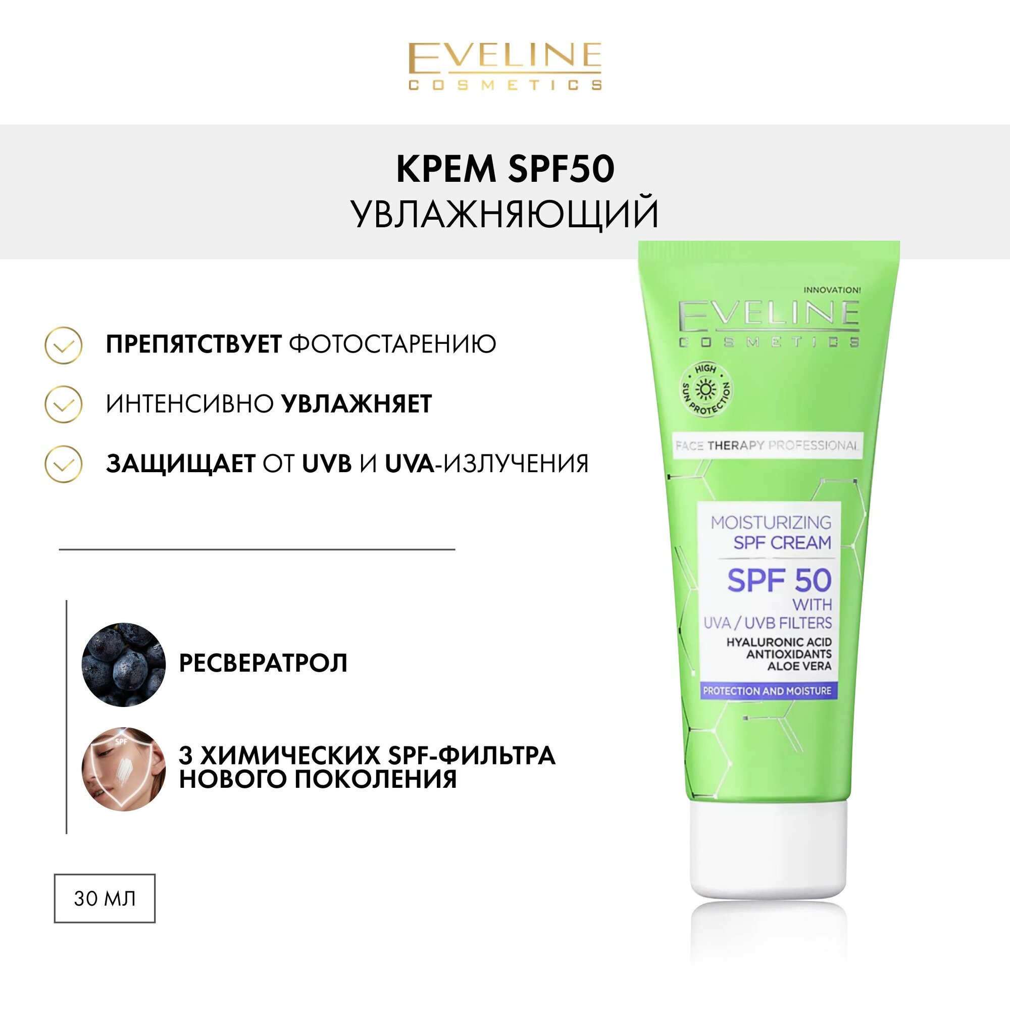 Крем для лица Еveline увлажняющий SPF 50 с фильтрами UVA и UVB 30 мл