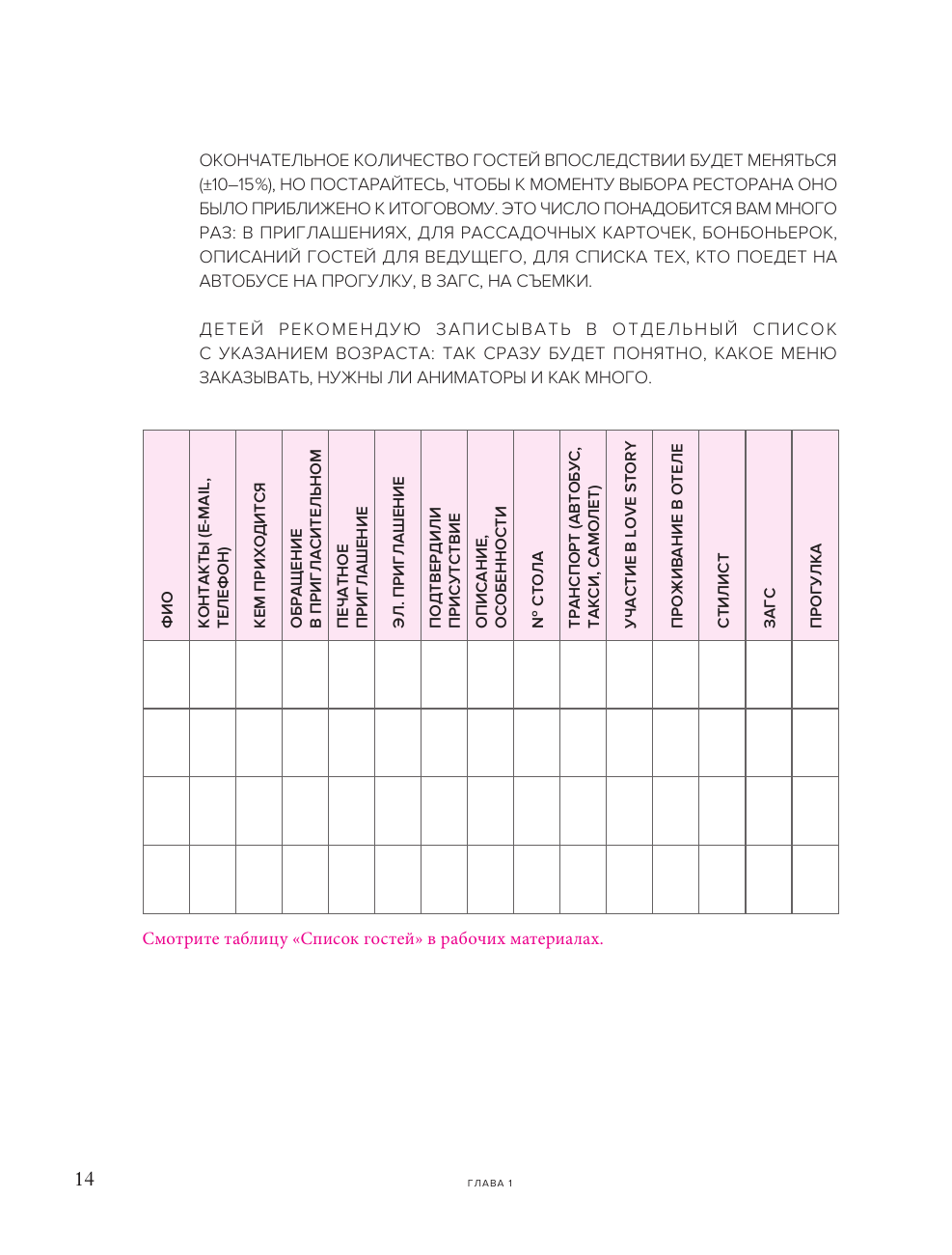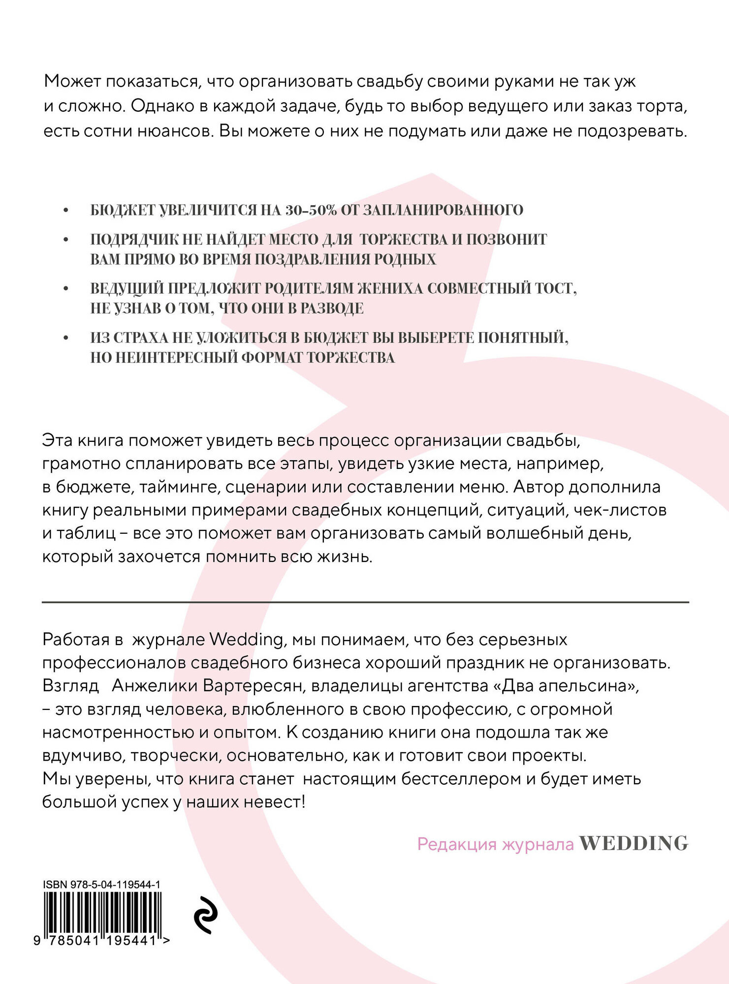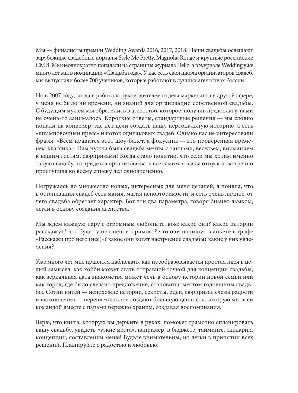 Самые важные вещи в жизни - не вещи. В организации свадьбы есть магия неповторимости. Первые встречи, общие увлечения, семейные традиции, слезы радости, сюрпризы. Каждая пара особенная - такой же должна быть и свадьба. Чтобы день вашей свадьбы сохранился в воспоминаниях на всю жизнь, его нужно правильно спланировать. Может показаться, что это не так уж и сложно, однако в каждой задаче, будь то выбор ведущего или заказ торта, есть сотни нюансов. Эта книга поможет увидеть весь процесс организации свадьбы, грамотно спланировать все этапы, увидеть узкие места, например, в бюджете, тайминге, сценарии или составлении меню. Автор дополнила книгу реальными примерами свадебных концепций, ситуаций, чек-листов и таблиц - все это поможет вам организовать самый волшебный день, который захочется помнить всю жизнь.