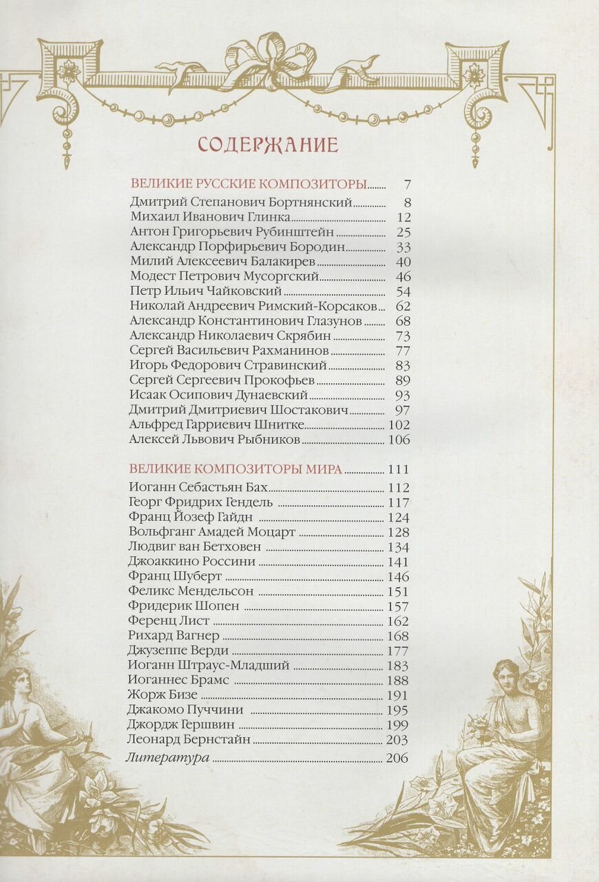 Эта книга – путеводитель по истории музыкального искусства в рассказах о судьбе и творчестве композиторов и о их легендарных операх, опереттах, симфониях и вальсах. Здесь вы найдете биографии 35 великих композиторов XVII–XX веков, классиков русского и европейского музыкального искусства. Бах и Бетховен, Моцарт и Шопен, Глинка и Чайковский, Шостакович и Стравинский, Дунаевский и Гершвин, и многие другие композиторы предстанут перед вами на страницах этой подарочной, красочно иллюстрированной книги во всем богатстве и многоплановости жизни и творчества.