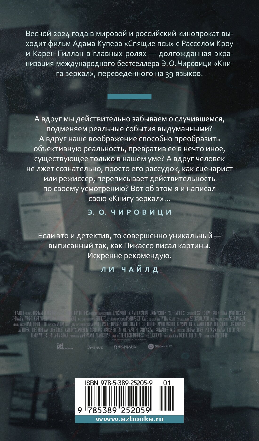 Весной 2024 года в мировой и российский кинопрокат выходит фильм Адама Купера «Спящие псы» — долгожданная экранизация романа Эуджена Овидиу Чировици «Книга зеркал» (переведенного на 39 языков «самого яркого литературного дебюта 2017 года») с Расселом Кроу и Карен Гиллан в главных ролях. Нью-йоркский литературный агент Питер Кац получает заявку на издание автобиографии под названием «Книга зеркал». К заявке приложено начало рукописи — некто Ричард Флинн вспоминает годы учебы в Принстоне, первую любовь, работу на знаменитого профессора психологии Джозефа Видера. Эти события 25-летней давности имели трагическую развязку, однако преступник остался не пойман и не разоблачен; теперь же Ричард вдруг увидел все происшедшее в ином свете, по-новому оценил роль своей бывшей возлюбленной Лоры Бейнс… но рукопись заканчивается на полуслове. Заинтригованный, Питер пытается заполучить остаток «Книги зеркал», однако рукопись оказывается такой же неуловимой, как правда о случившемся четверть века назад… «Спящие псы» («Книга зеркал») — это роман-загадка в духе «Ночного кино» Мариши Пессл. Это книга о том, как воображение безотчетно подменяет реальность. Это книга о секретной власти историй — тех, которые мы рассказываем, тех, которые мы скрываем, и тех, ради сохранения которых в тайне мы готовы на все.