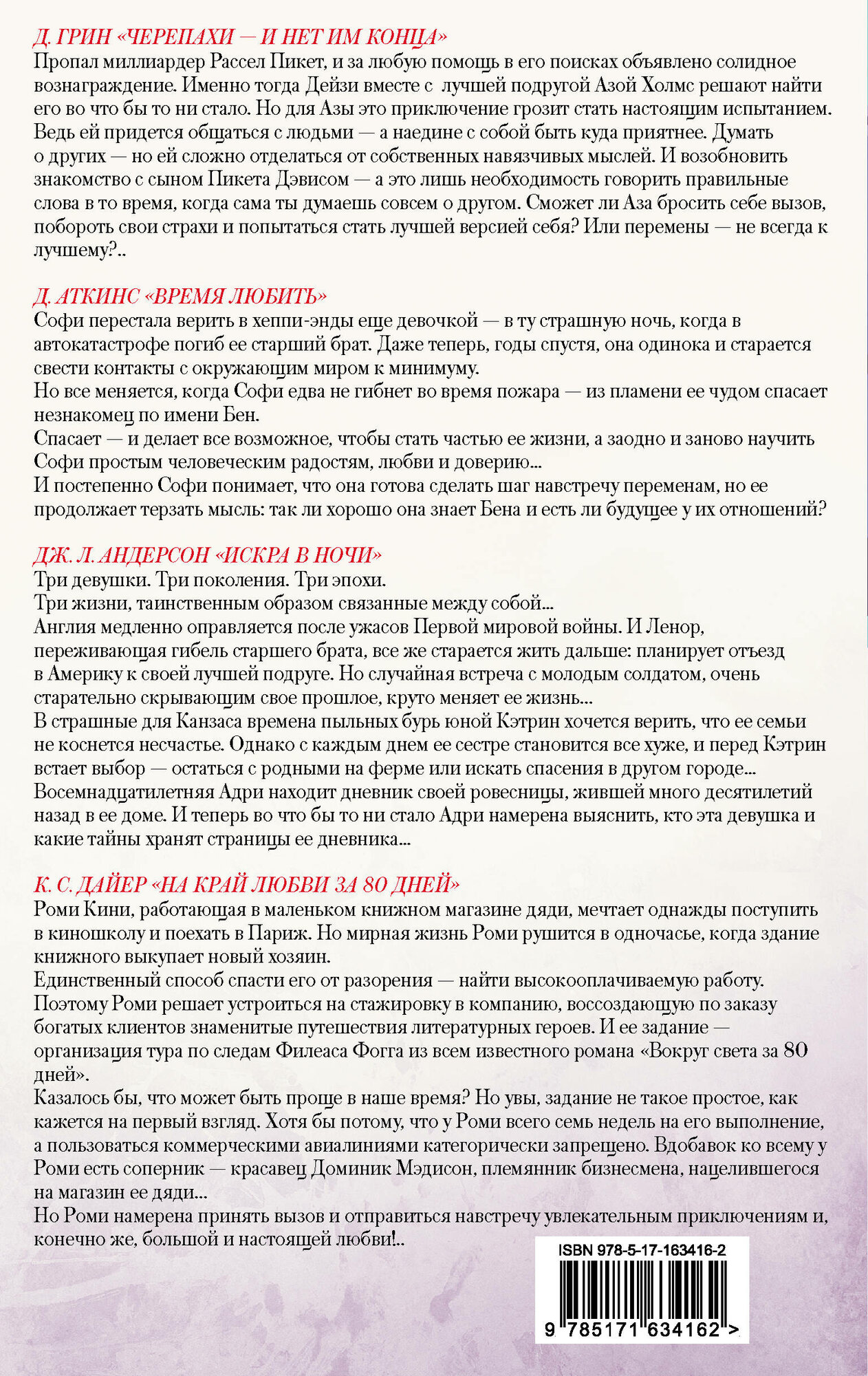 Д. Аткинс "Время любить" Софи перестала верить в хеппи-энды еще девочкой - в ту страшную ночь, когда в автокатастрофе погиб ее старший брат. Даже теперь, годы спустя, она одинока и старается свести контакты с окружающим миром к минимуму. Но все меняется, когда Софи едва не гибнет во время пожара - из пламени ее чудом спасает незнакомец по имени Бен. Спасает - и делает все возможное, чтобы стать частью ее жизни, а заодно и заново научить Софи простым человеческим радостям, любви и доверию. И постепенно Софи понимает, что она готова сделать шаг навстречу переменам, но ее продолжает терзать мысль: так ли хорошо она знает Бена и есть ли будущее у их отношений? Дж. Л. Андерсон "Искра в ночи" Три девушки. Три поколения. Три эпохи. Три жизни, таинственным образом связанные между собой. Англия медленно оправляется после ужасов Первой мировой войны. И Ленор, переживающая гибель старшего брата, все же старается жить дальше: планирует отъезд в Америку к своей лучшей подруге. Но случайная встреча с молодым солдатом, очень старательно скрывающим свое прошлое, круто меняет ее жизнь. В страшные для Канзаса времена пыльных бурь юной Кэтрин хочется верить, что ее семьи не коснется несчастье. Однако с каждым днем ее сестре становится все хуже, и перед Кэтрин встает выбор - остаться с родными на ферме или искать спасения в другом городе. Восемнадцатилетняя Адри находит дневник своей ровесницы, жившей много десятилетий назад в ее доме. И теперь во что бы то ни стало Адри намерена выяснить, кто эта девушка и какие тайны хранят страницы ее дневника. К. С. Дайер "На край любви за 80 дней" Роми Кини, работающая в маленьком книжном магазине дяди, мечтает однажды поступить в киношколу и поехать в Париж. Но мирная жизнь Роми рушится в одночасье, когда здание книжного выкупает новый хозяин. Единственный способ спасти его от разорения - найти высокооплачиваемую работу. Поэтому Роми решает устроиться на стажировку в компанию, воссоздающую по заказу богатых клиентов знаменитые путешествия литературных героев. И ее задание - организация тура по следам Филеаса Фогга из всем известного романа "Вокруг света за 80 дней". Казалось бы, что может быть проще в наше время? Но увы, задание не такое простое, как кажется на первый взгляд. Хотя бы потому, что у Роми всего семь недель на его выполнение, а пользоваться коммерческими авиалиниями категорически запрещено. Вдобавок ко всему у Роми есть соперник - красавец Доминик Мэдисон, племянник бизнесмена, нацелившегося на магазин ее дяди. Но Роми намерена принять вызов и отправиться навстречу увлекательным приключениям и, конечно же, большой и настоящей любви!. Д. Грин "Черепахи - и нет им конца" Пропал миллиардер Рассел Пикет, и за любую помощь в его поисках объявлено солидное вознаграждение. Именно тогда Дейзи вместе с лучшей подругой Азой Холмс решают найти его во что бы то ни стало. Но для Азы это приключение грозит стать настоящим испытанием. Ведь ей придется общаться с людьми - а наедине с собой быть куда приятнее. Думать о других - но ей сложно отделаться от собственных навязчивых мыслей. И возобновить знакомство с сыном Пикета Дэвисом - а это лишь необходимость говорить правильные слова в то время, когда сама ты думаешь совсем о другом. Сможет ли Аза бросить себе вызов, побороть свои страхи и попытаться стать лучшей версией себя? Или перем