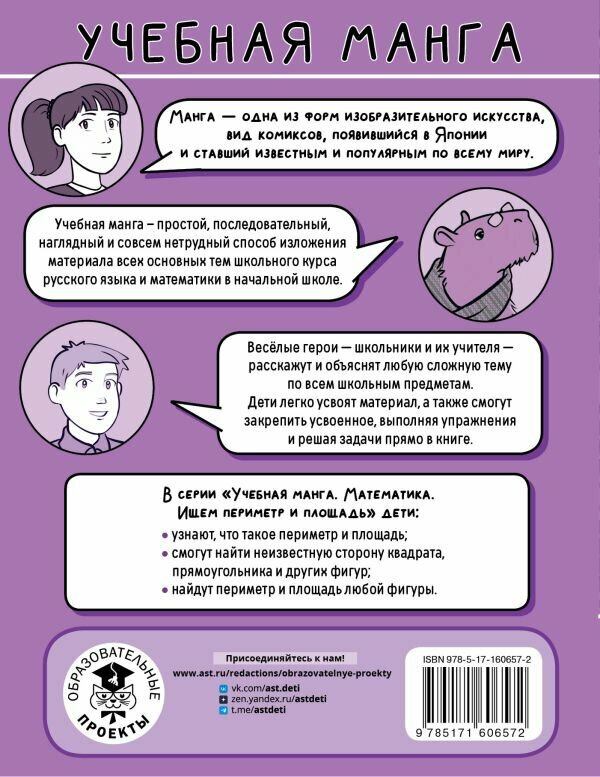 Учебная манга — простой, последовательный, наглядный и совсем нетрудный способ изложения материала всех основных тем школьного курса русского языка в начальной школе. Весёлые герои — школьники и их учителя — расскажут и объяснят любую сложную тему по всем школьным предметам. Можно легко запомнить материал, а также закрепить усвоенное, выполняя упражнения и решая задачи прямо в книге. В серии "Учебная манга. Математика. Ищем периметр и площадь" дети: – узнают, что такое периметр и площадь; – смогут найти неизвестную сторону квадрата, прямоугольника и других фигур; – найдут периметр и площадь любой фигуры.