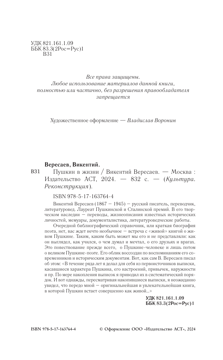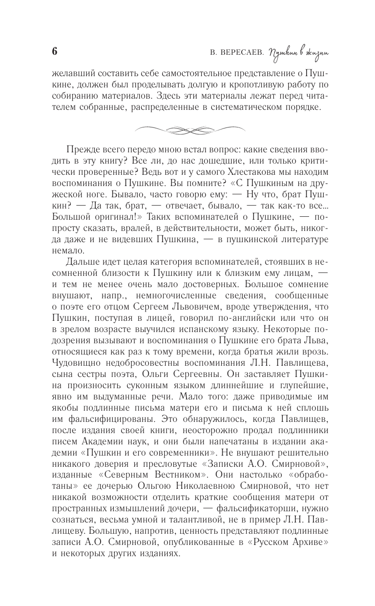 Перед вами не очередной библиографический справочник, или краткая биография поэта, нет, вас ждет нечто необычное – встреча с «живой» книгой о живом Пушкине. Таким, каким быть может мы его и не представляли: как он выглядел, как учился, о чем думал и мечтал, о его друзьях и врагах. Это повествование прежде всего, о Пушкине-человеке и лишь потом о великом Пушкине-поэте. Его облик воссоздан по воспоминаниям его современников и историческим документам. Читатель узнавал основное: как протекала жизнь Пушкина, как он выглядел, что думали о нем некоторые современники и потомки. Всего этого было очень мало, поистине собрано было самое необходимое, однако на небольшом примере видно, что удалось сделать Вересаеву в развитие этой идеи. Он своим обширным монтажом добился портретности. Вот, как сам В. Вересаев писал об этом: «В течение ряда лет я делал для себя из первоисточников выписки, касавшиеся характера Пушкина, его настроений, привычек, наружности и пр. По мере накопления выписок я приводил их в систематический порядок. И вот однажды, пересматривая накопившиеся выписки, я неожиданно увидел, что передо мной – оригинальнейшая и увлекательнейшая книга, в которой Пушкин встает совершенно как живой…» В. Вересаев Первая публикация этой книги (1926–1927) вызвала острые дискуссии в: Пушкин, представленный Вересаевым, не вписывался в ранее принятые стандарты. Тем не менее книга оказалась очень востребованной: она неоднократно переиздавалась и до сих пор, спустя почти сто лет после своего появления, не утратила актуальности. О авторе Викентий Вересаев — замечательный русский писатель, переводчик, литературовед. Он известен не только своей художественной прозой, но и литературоведческими работами, и переводами эллинских поэтов. Одна из самых известных его книг — «Пушкин в жизни» — имеет подзаголовок «Систематический свод подлинных свидетельств». В. В. Вересаев по существу открыл новый жанр — биография-хроника.