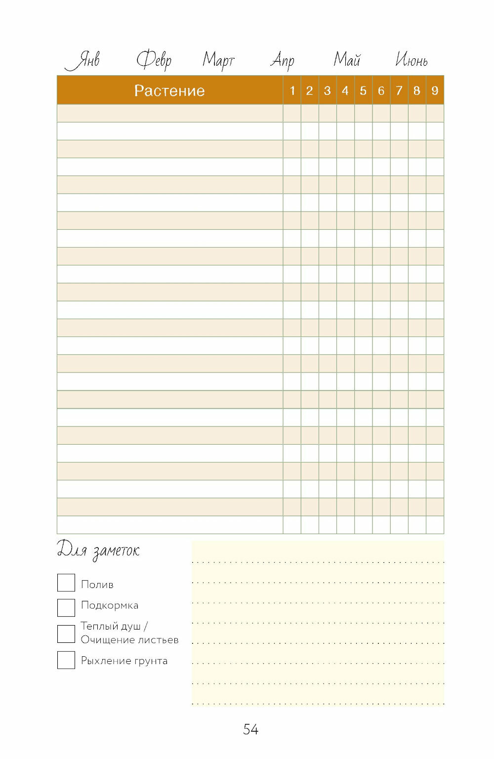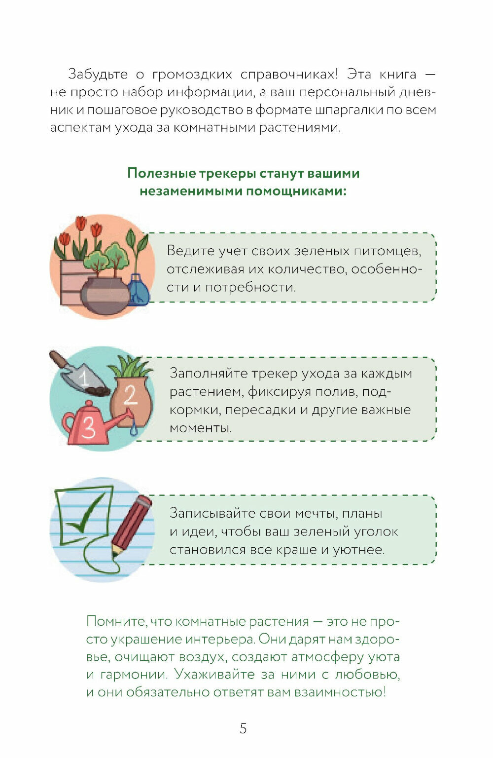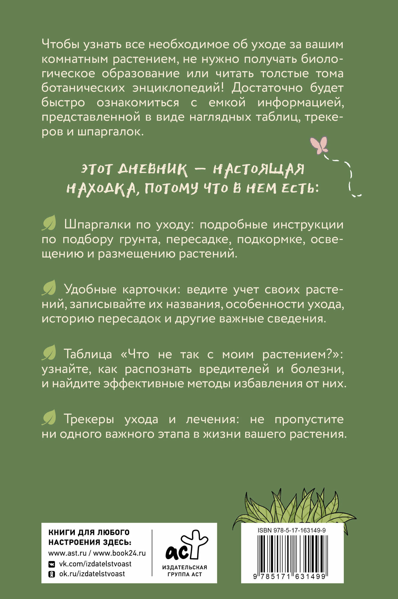 Чтобы узнать все необходимое об уходе за вашим комнатным растением, не нужно получать биологическое образование или читать толстые тома ботанических энциклопедий! Достаточно будет быстро ознакомиться с емкой информацией, представленной в виде наглядных таблиц, трекеров и шпаргалок.Этот дневник — настоящая находка, потому что в нем есть:• Шпаргалки по уходу: подробные инструкции по поливу, подбору грунта, освещению, температуре, влажности и размещению растений.• Удобные карточки: ведите учет своих растений, записывайте их названия, особенности ухода, историю пересадок и другие важные сведения.• Таблица «Что не так с моим растением?»: узнайте, как распознать вредителей и болезни, и найдите эффективные методы избавления от них.• Трекеры ухода и лечения: не пропустите ни одного важного этапа в жизни вашего растения.