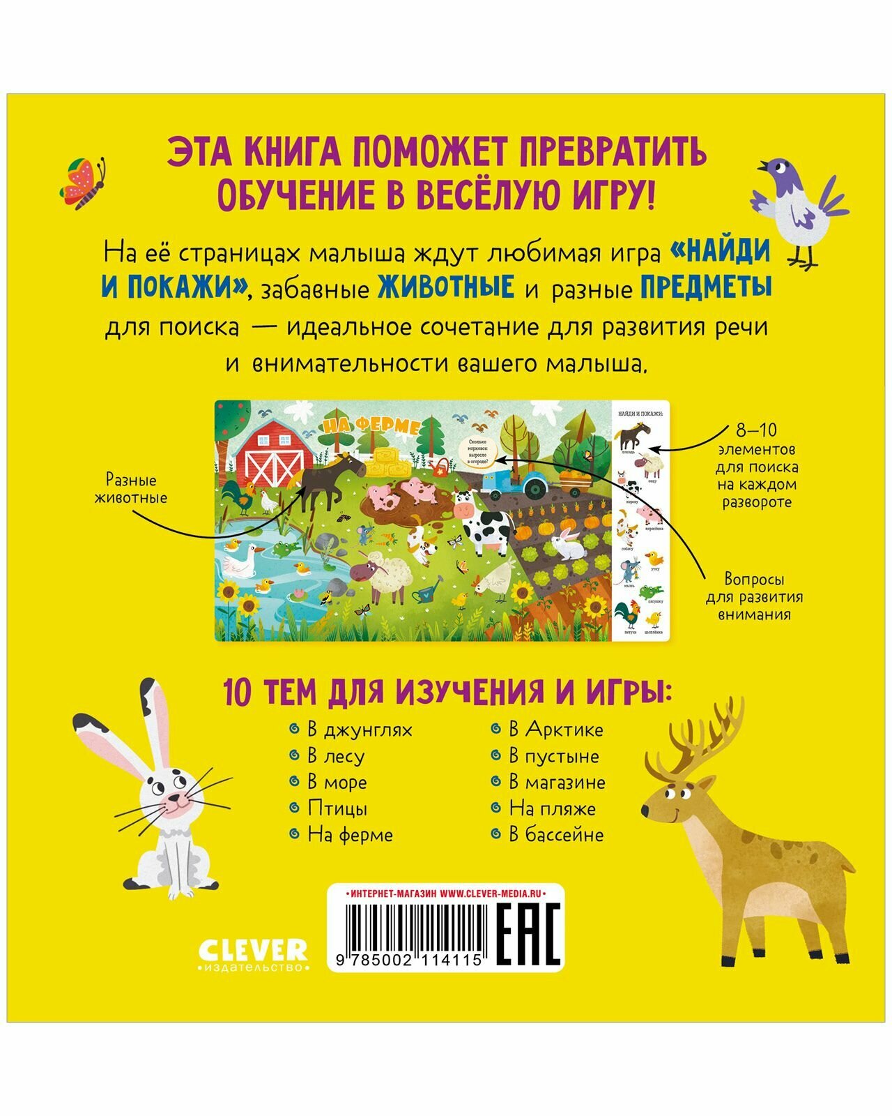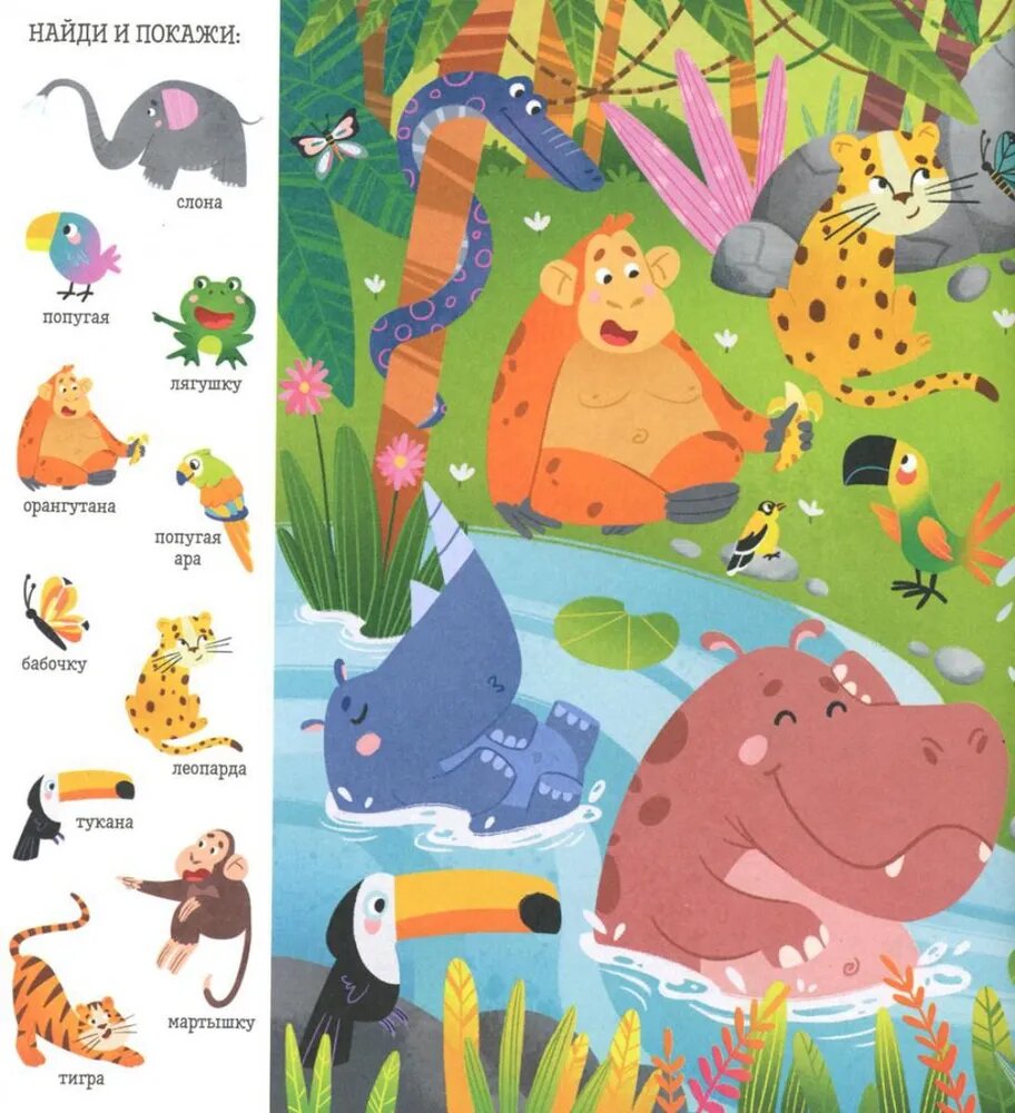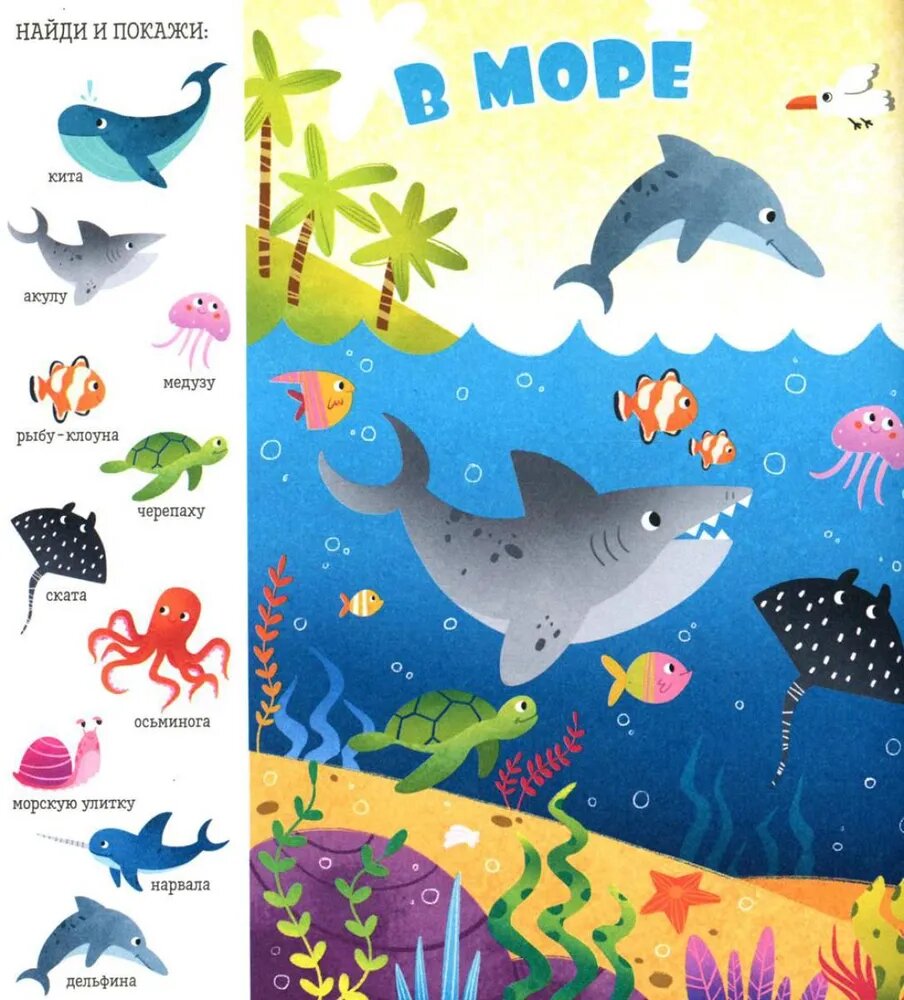 Эта книга поможет превратить обучение в весёлую игру! На её страницах малыша ждут любимая игра «найди и покажи», забавные животные и разные предметы для поиска - идеальное сочетание для развития речи и внимательности вашего малыша. 10 тем для изучения и игры: В джунглях В лесу В море Птицы На ферме В Арктике В пустыне В магазине На пляже В бассейне