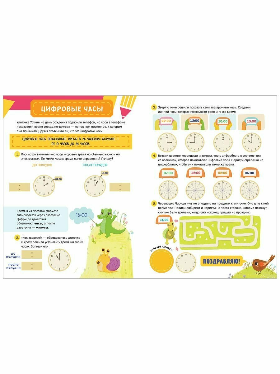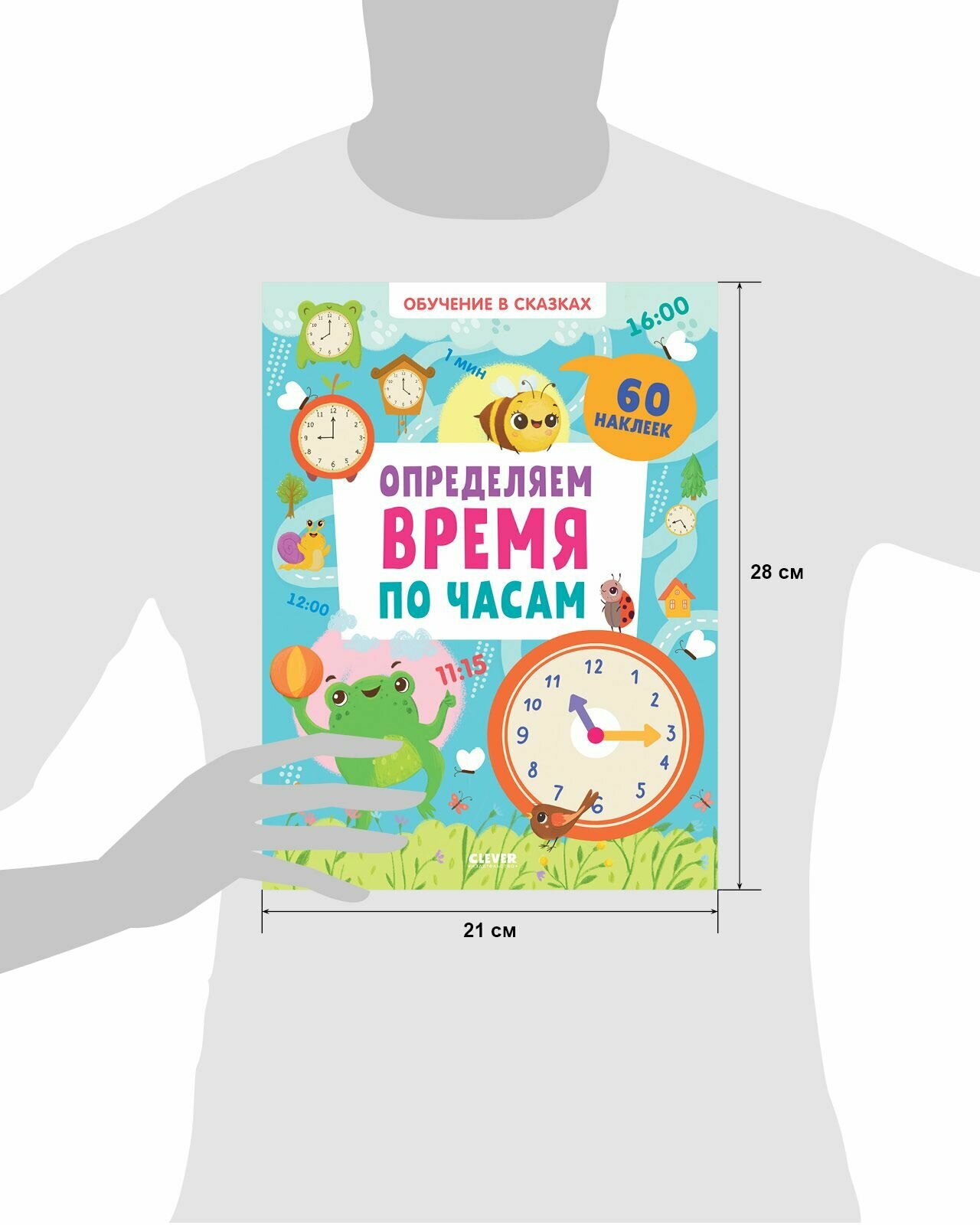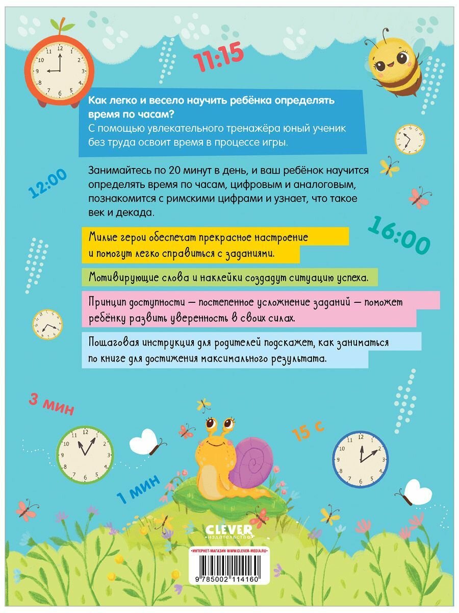 Как легко и весело научить ребёнка определять время по часам? С помощью увлекательного тренажёра юный ученик без труда освоит время в процессе игры. Занимайтесь по 20 минут в день, и ваш ребёнок научится определять время по часам, цифровым и аналоговым, познакомится с римскими цифрами и узнает, что такое век и декада. Милые герои обеспечат прекрасное настроение и помогут легко справиться с заданиями Мотивирующие слова и наклейки создадут ситуацию успеха Принцип доступности - постепенное усложнение заданий - поможет ребёнку развить уверенность в своих силах Пошаговая инструкция для родителей подскажет, как заниматься по книге для достижения максимального результата