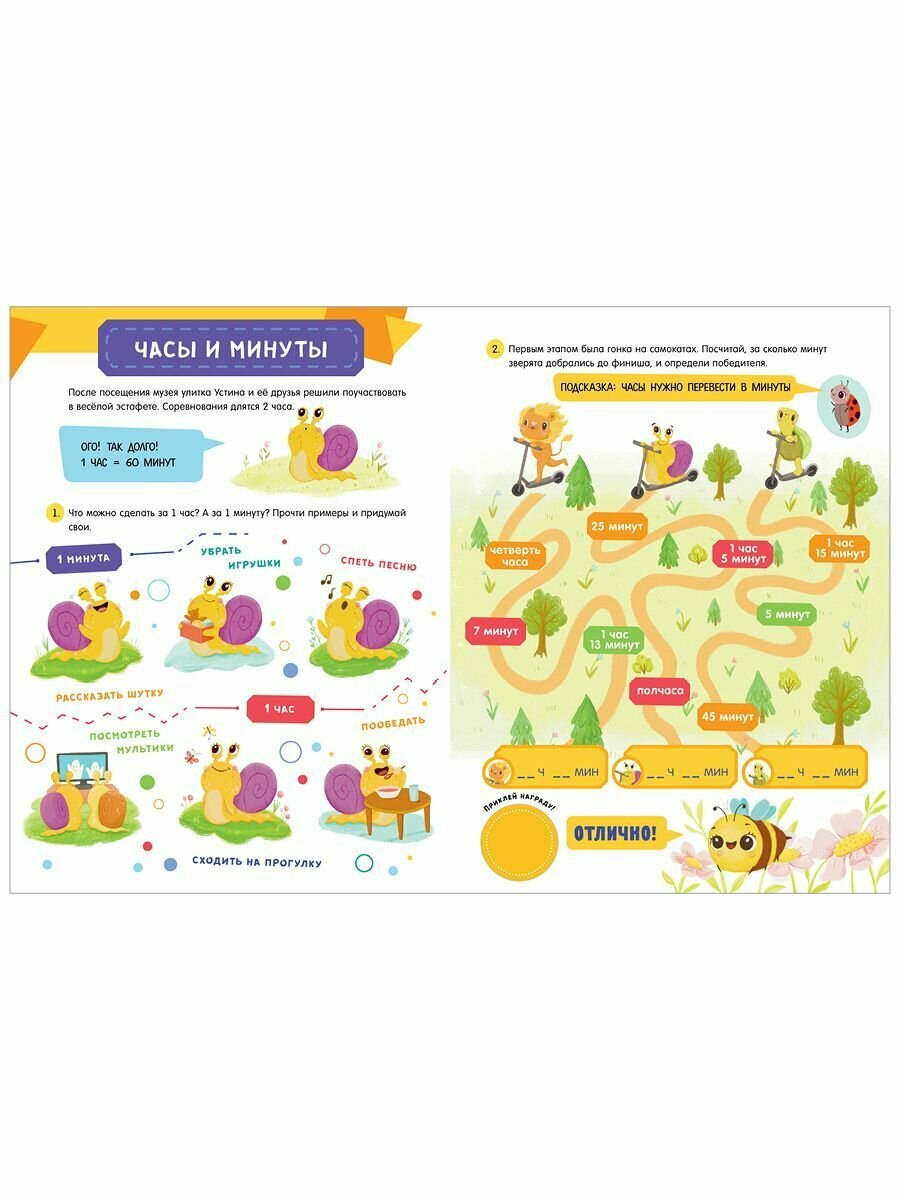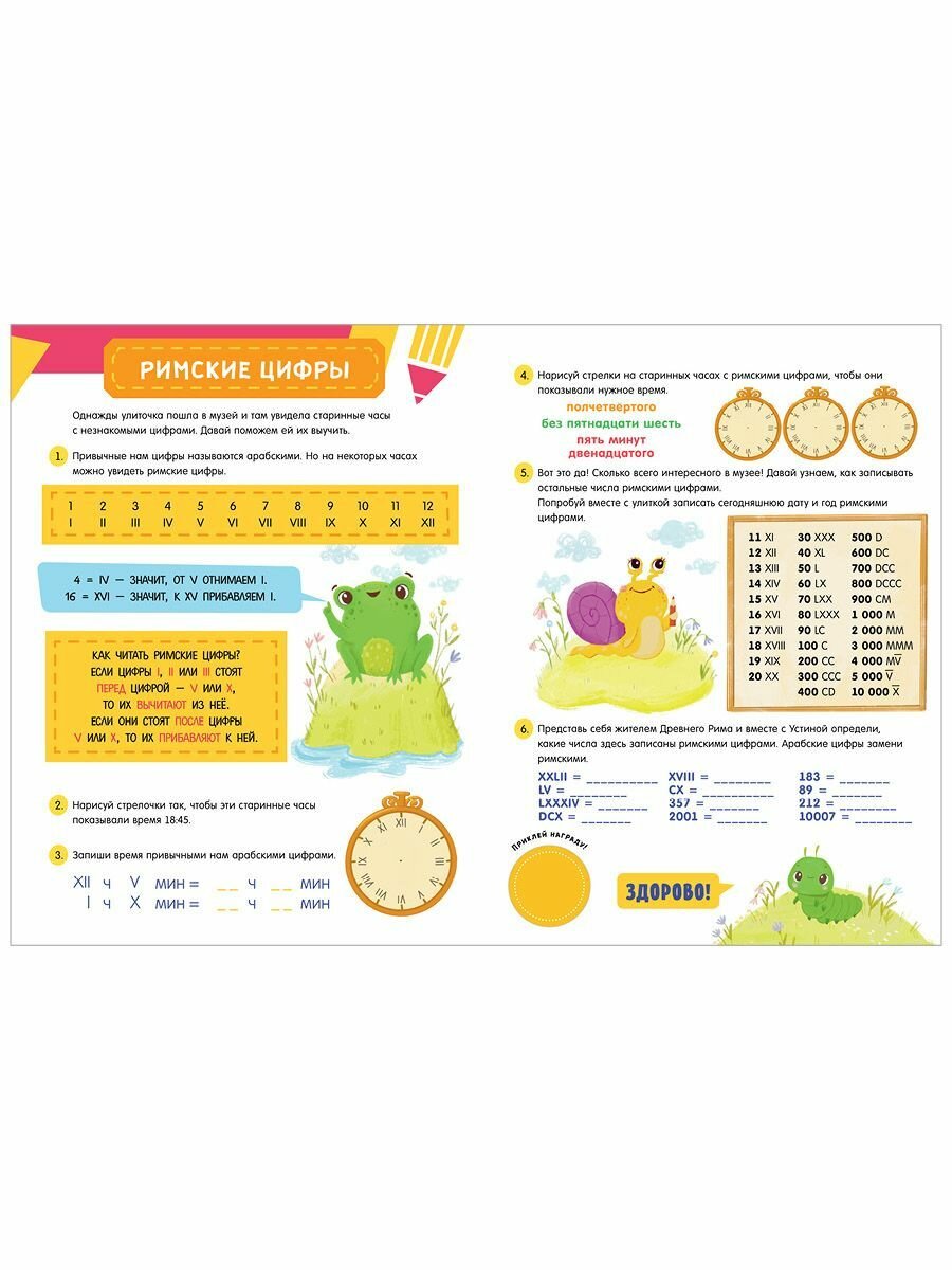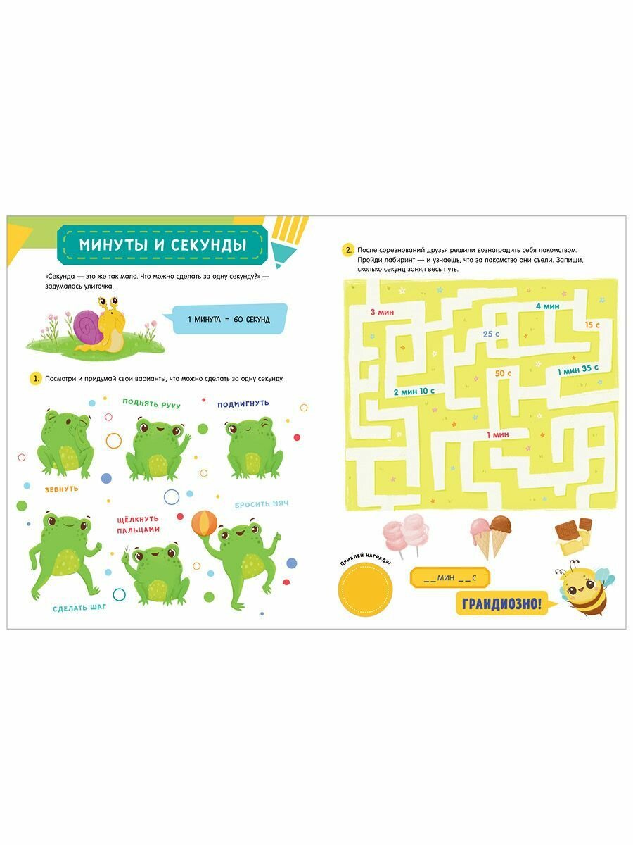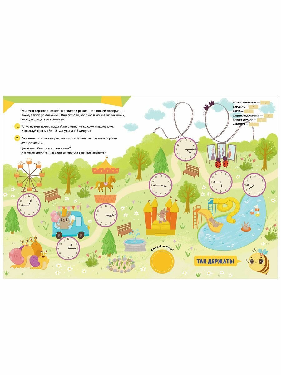 Как легко и весело научить ребёнка определять время по часам? С помощью увлекательного тренажёра юный ученик без труда освоит время в процессе игры. Занимайтесь по 20 минут в день, и ваш ребёнок научится определять время по часам, цифровым и аналоговым, познакомится с римскими цифрами и узнает, что такое век и декада. Милые герои обеспечат прекрасное настроение и помогут легко справиться с заданиями Мотивирующие слова и наклейки создадут ситуацию успеха Принцип доступности - постепенное усложнение заданий - поможет ребёнку развить уверенность в своих силах Пошаговая инструкция для родителей подскажет, как заниматься по книге для достижения максимального результата