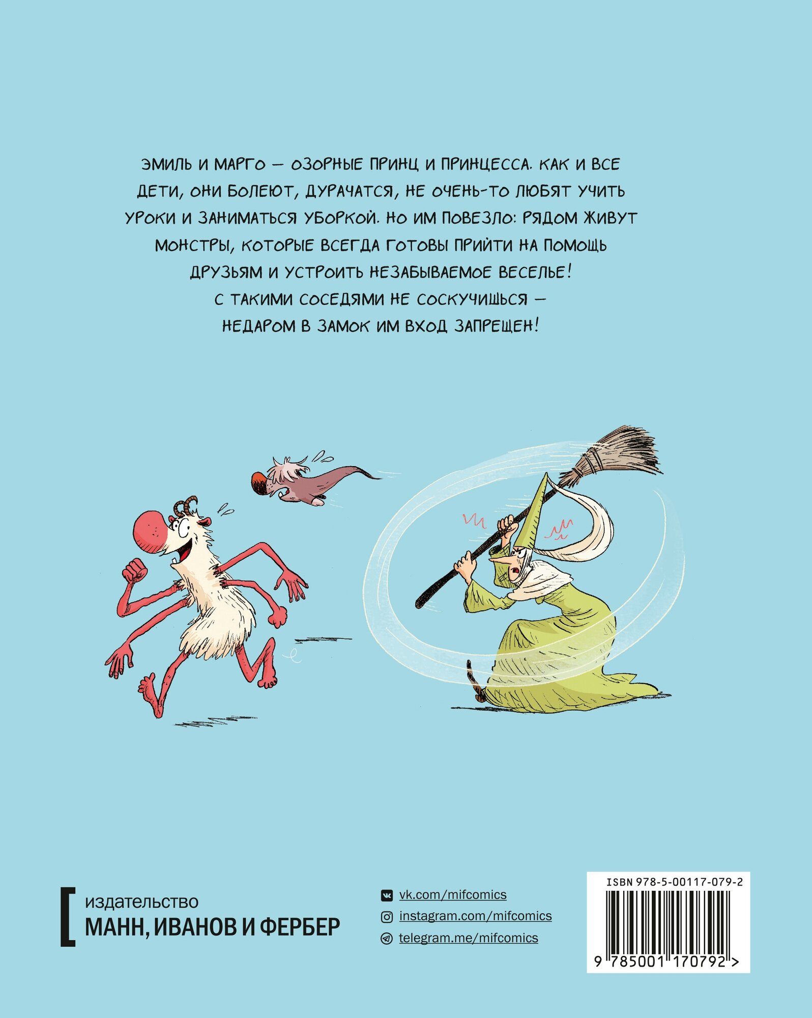 Тяжело быть принцем и принцессой. Приходится учиться этикету, выполнять скучные задания гувернантки, мадам Дисциплинды, и успевать ходить в школу. Но как же здорово, что рядом всегда есть монстры, готовые прийти на помощь и устроить незабываемое веселье! Эмиля и Марго ждут потрясающие приключения: они устроят охоту на ночные кошмары, сорвут урок садоводства, отправятся на экскурсию за зеркальную раму и сделают многое-многое другое. Главное, не попасться гувернантке: она терпеть не может монстров. В замок им вход запрещен! Фишки книги: — Волшебный мир, населенный забавными монстриками — вовсе не страшными, а добрыми и дружелюбными. — Яркие герои, которые будут близки детям. — Веселые добрые истории о повседневных делах с примесью волшебства. Описанные ситуации знакомы каждому ребенку: принц и принцесса убираются в комнате, болеют, сажают цветы в огороде, наряжают елку, ходят в школу. — Короткие рассказы (в каждом всего 6 страниц) идеально подойдут для маленьких читателей — перед сном можно прочитать 2-3 истории и спокойно засыпать. О серии Эмиль и Марго — озорные принц и принцесса. Как и все дети, они болеют, дурачатся, не очень-то любят учить уроки и заниматься уборкой. Эмиль и Марго живут в замке рядом с лесом, населенным монстриками. С такими соседями не соскучишься — принц и принцесса постоянно попадают во всякие переделки с этими монстриками, сводя с ума присматривающую за ними мадам Дисциплинду. Для кого эта книга: Для детей от 5 лет. Для всей семьи, если вы любите читать и веселиться вместе. Для всех любителей комиксов.
