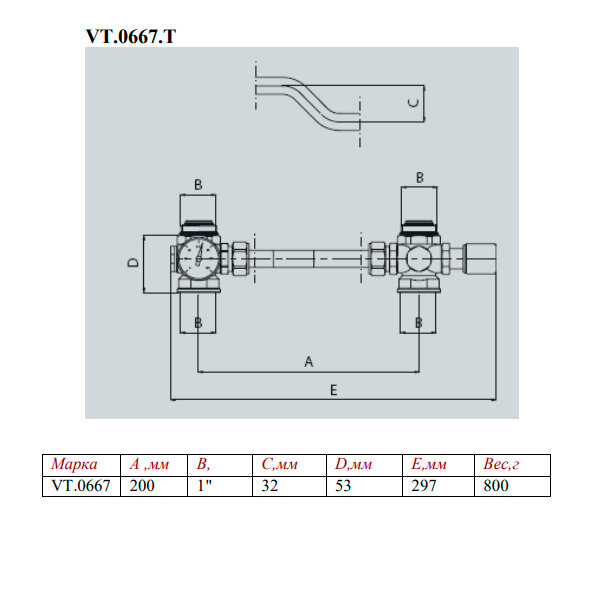 Байпас проходной Valtec с перепускным клапаном и термометром 200 мм VT.0667T.0.0