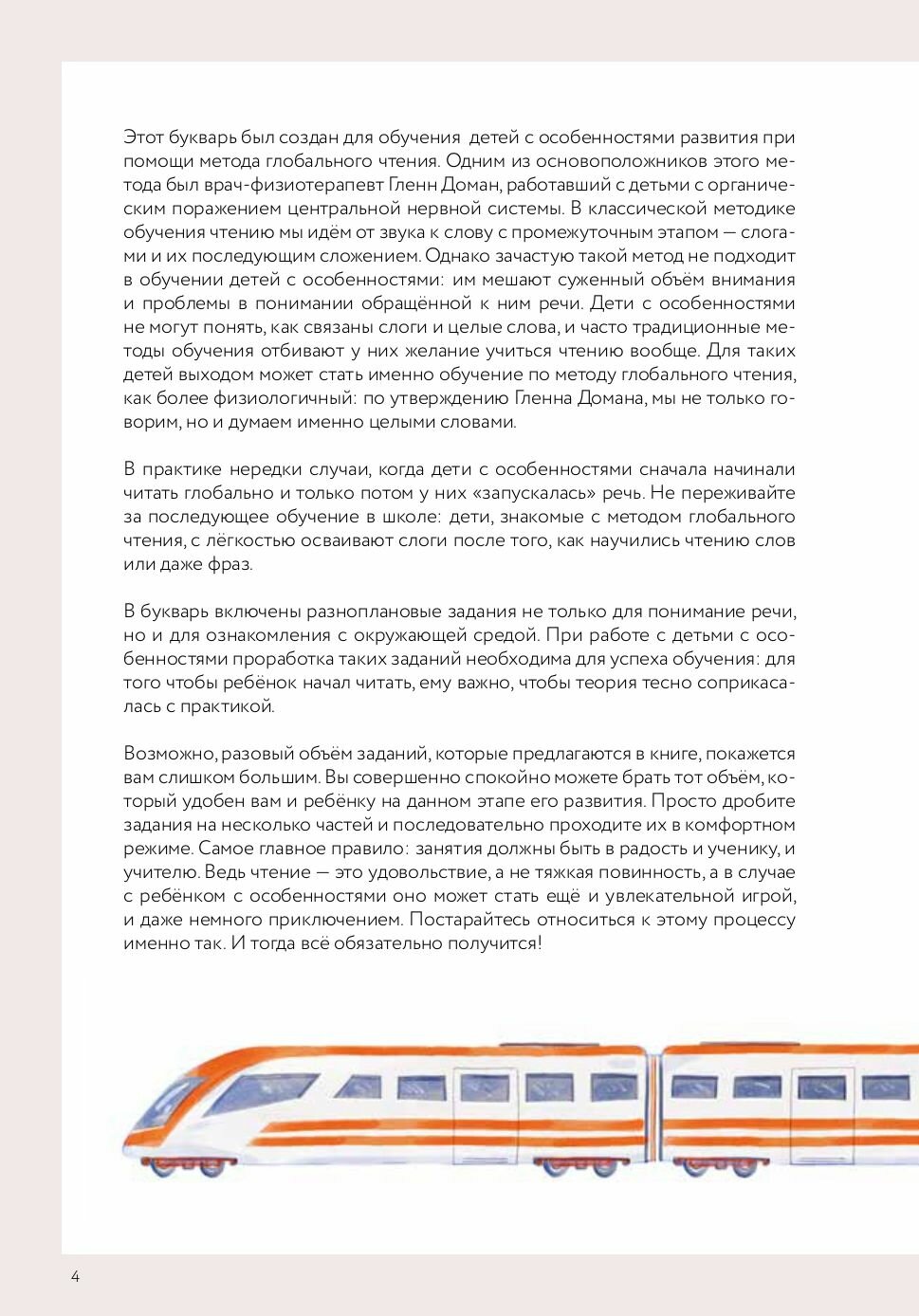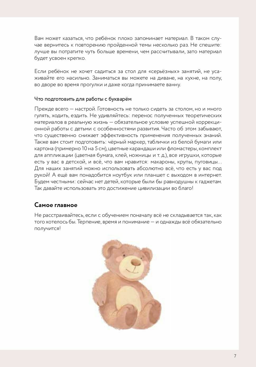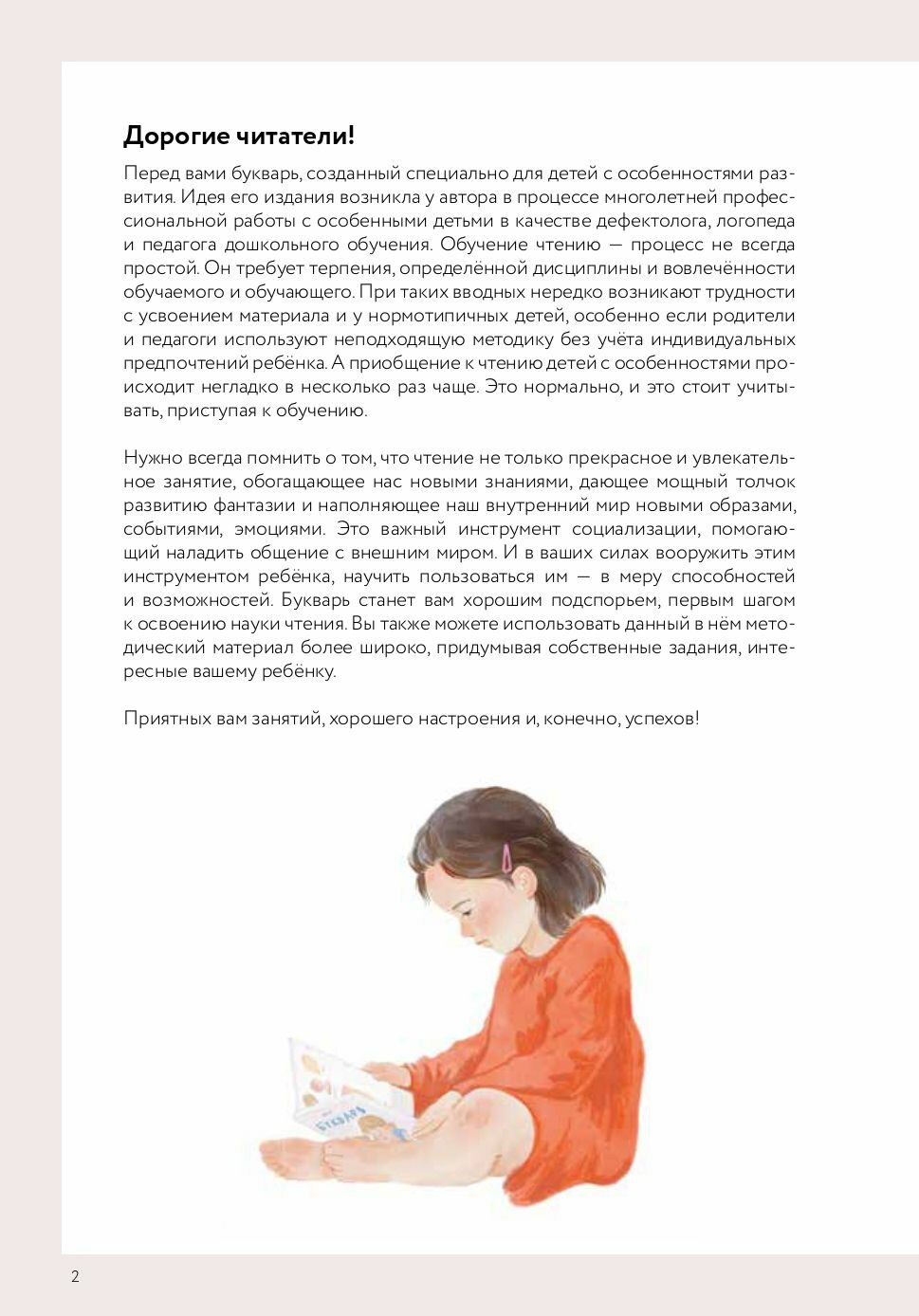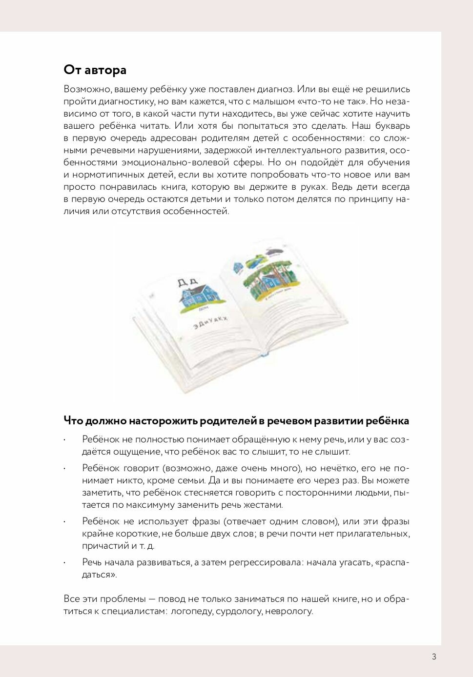 "Когда вы будете заниматься с ребёнком по нашей книге, не исключено, что вам придётся не раз столкнуться с мнением о том, что детям с особенностями не стоит объяснять и показывать множество моментов, вынесенных в задания букваря: мол, они всё равно не поймут, так зачем тратить время и силы? Я искренне надеюсь, что мои читатели — замечательные родители и педагоги, которые не станут прислушиваться к этому «ценному» мнению и на практике убедятся, что необычные дети понимают и могут гораздо больше, чем от них ждут."