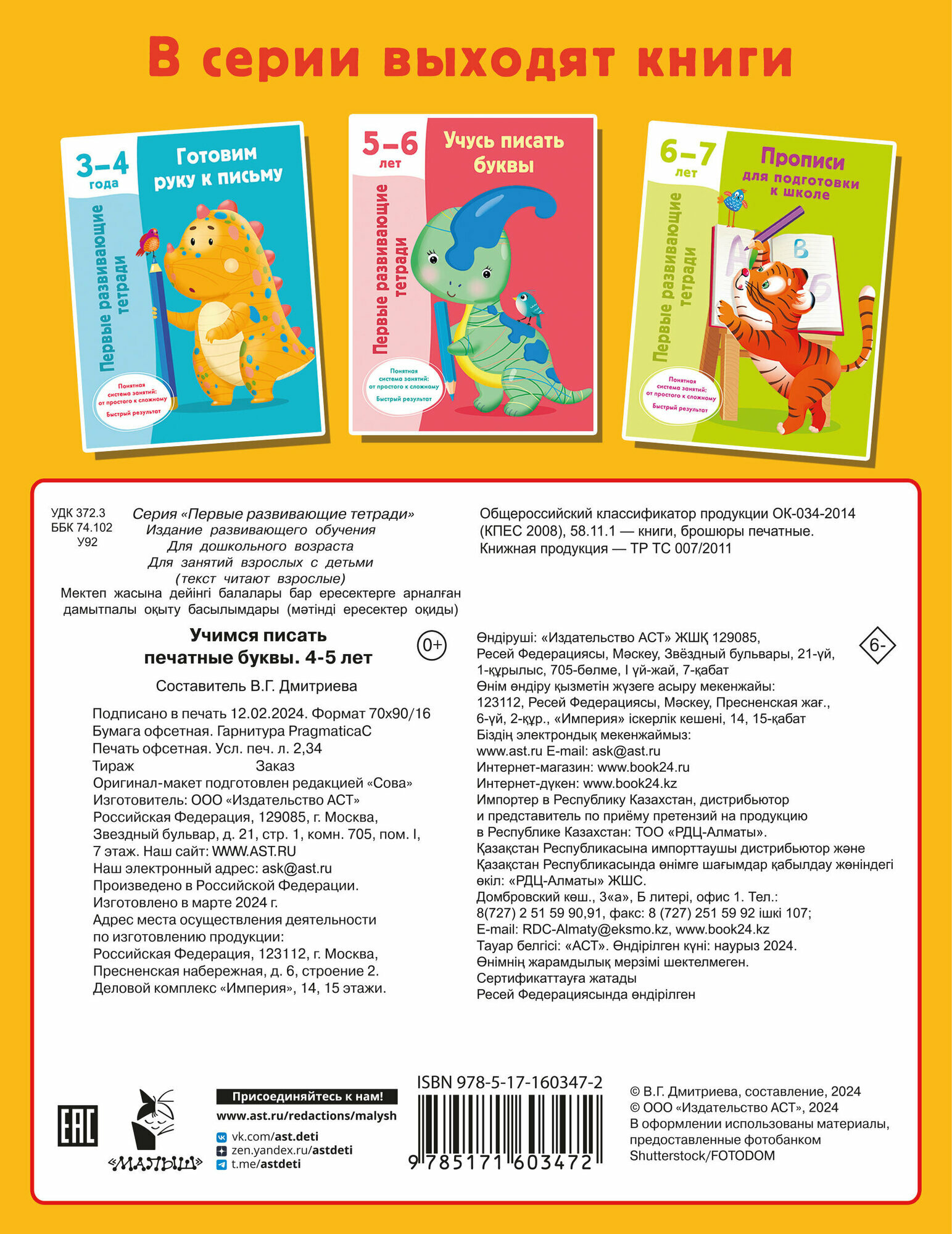 Учимся писать печатные буквы. 4-5 лет (Дмитриева Валентина Геннадьевна); Сова. Малыш (Обучающая и развивающая литература), 2024