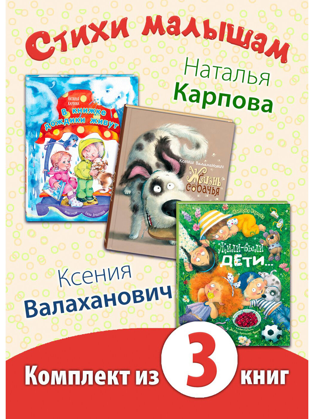 Задорные стихотворные книжки детских поэтов Ксении Валаханович и Натальи Карповой расскажут маленькому читателю о том, как весело живут на свете дети и как устроена жизнь собачья. А еще здесь поселились самые разные дождики! Познакомиться с этими жителями нашей планеты помогут красочные, живые и выразительные иллюстрации Елены Дроботовой и Любови Ерёминой-Ношин.В комплект включены три книги для малышей и дошкольников:Жили-были дети (автор Н. Карпова, художник Л. Ерёмина-Ношин);Жизнь собачья (автор К. Валаханович, художник Л. Ерёмина-Ношин);В книжке дождики живут (автор Н. Карпова, художник Е. Дроботова).Для чтения взрослыми детям