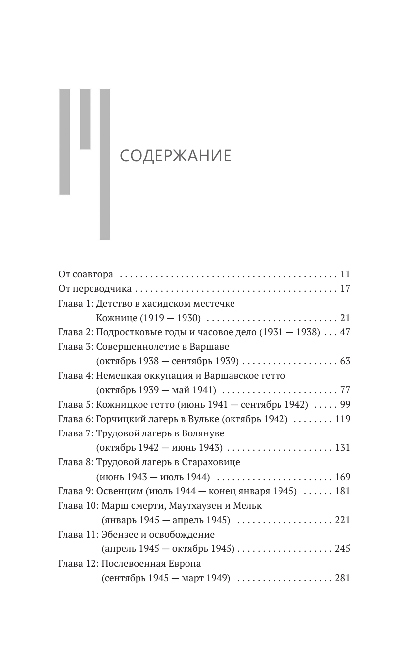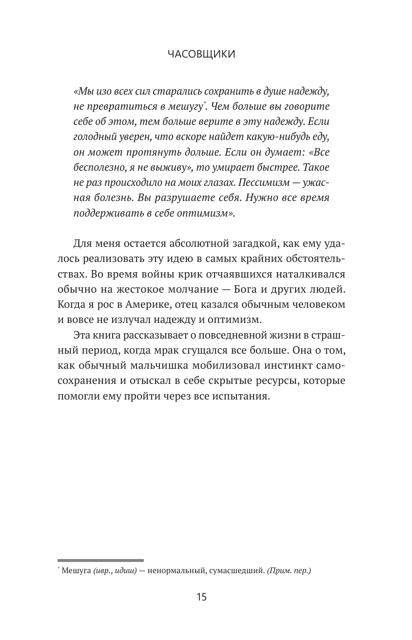 Новинка в коллекции Бомбора Story. История жизни трех братьев-часовщиков, их обучения ремеслу в мастерской отца, тяжелых испытаниях и воодушевляющих моментах до, во время и после Второй мировой войны. Выживание в гетто и лагерях благодаря уникальной профессии. Мужество и взаимовыручка в нечеловеческих условиях. Трогательное описание братства и отцовства. Признание важности семьи и веры. Уникальный рассказ о том, как важно успеть рассказать детям историю своей жизни. Книга основана на десятилетних интервью Скотта Ленга со своим отцом Гарри. Книга дополнена фотографиями, документами и картами времен Второй мировой войны.