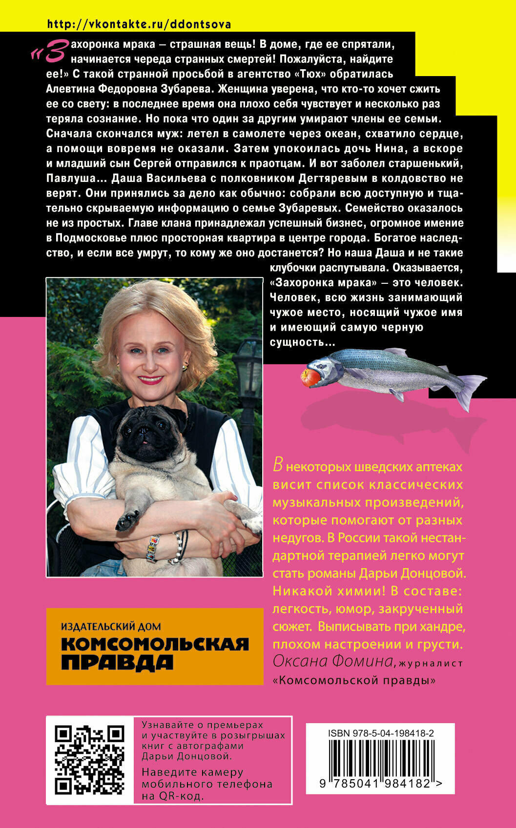 70-я книга из цикла "Любительница частного сыска Даша Васильева". "Захоронка мрака - страшная вещь! В доме, где ее спрятали, начинается череда странных смертей! Пожалуйста, найдите ее! ". С такой странной просьбой в агентство "Тюх" обратилась Алевтина Федоровна Зубарева. Женщина уверена, что кто-то хочет сжить ее со свету: она в последнее время себя очень плохо чувствует и несколько раз теряла сознание. Но пока что один за другим умирают члены ее семьи. Сначала в самолете скончался муж: сердце засбоило в самолете, а летел через океан и помощи не оказали. Затем упокоилась дочь Нина, вскоре младший сын Сергей отправился к праотцам. А теперь заболел и старшенький Павлуша. Даша Васильева с полковником Дегтяревым в колдовство не верят, поэтому принялись за дело как обычно: собрали всю доступную и тщательно скрываемую информацию о семье Зубаревых. Семейство оказалось не из простых. Главе клана принадлежал успешный бизнес в разных сферах, огромное имение в Подмосковье, плюс просторная квартира в центре города. Явно кто-то хочет заполучить наследство! А если все умрут, то кому же достанется все это богатство? Но наша Даша и не такие клубочки распутывала, она выяснила, что "захоронкой мрака" оказался человек, всю жизнь занимающий чужое место, носящий чужое имя и имеющий самую черную сущность. Дарья Донцова - самый популярный и востребованный автор в нашей стране, любимица миллионов читателей. В России продано более 200 миллионов экземпляров ее книг. Ее творчество наполняет сердца и души светом, оптимизмом, радостью, уверенностью в завтрашнем дне! "Донцова невероятная работяга! Я не знаю ни одного другого писателя, который столько работал бы. Я отношусь к ней с уважением, как к образцу писательского трудолюбия. Женщины нуждаются в психологической поддержке и получают ее от Донцовой. Я и сама в свое время прочла несколько романов Донцовой. Ее читают очень разные люди. И очень занятые бизнес-леди, чтобы на время выключить голову, и домохозяйки, у которых есть перерыв 15-20 минут между отвести-забрать детей". - Галина Юзефович, литературный критик