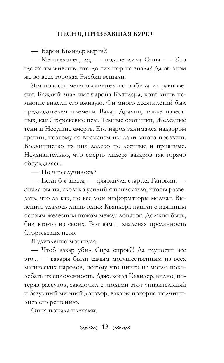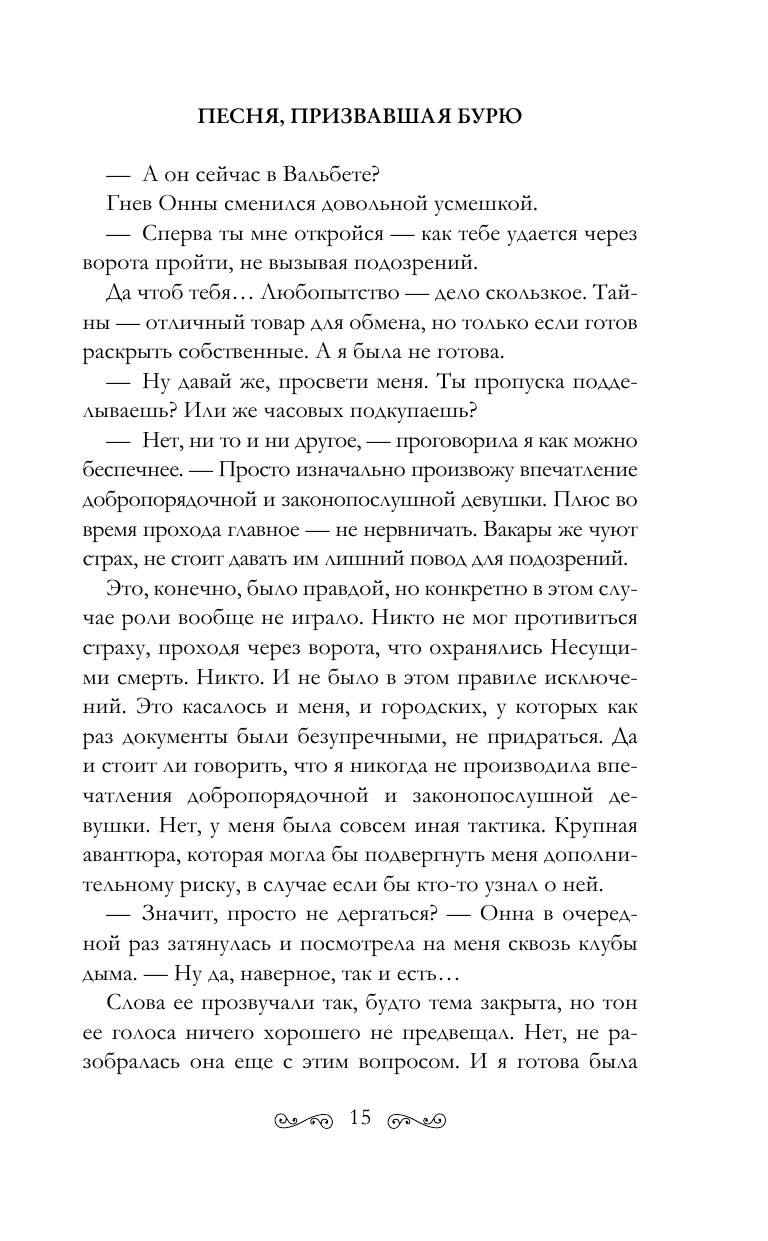 Города, селенья и дороги во власти людей, леса же ‒ царство кидхов, магических созданий. Так гласит мирный договор, который строго соблюдается и поныне. Но Синту не волнуют законы и порядки. Ее, наполовину человека, наполовину кидха, не принимает ни одна из сторон. Особенно ее не жалуют вакары, темный народ, что правит в Вальбете. В страшную снежную бурю Синта ищет укрытие в ночлежке в мире людей, и с этого момента для нее все меняется. В маленькой глухой деревушке совершено убийство, а раскрыть преступление берет на себя сам Арезандер, харизматичный лидер вакаров, который сразу же замечает Синту. Во-первых, у девушки дар: она способна околдовать человека песней, а во-вторых, Синта по-настоящему прекрасна. Но рано или поздно вакары узнают: девушка – та, кто призвала бурю, и лишь она в ответе за то, что случилось…