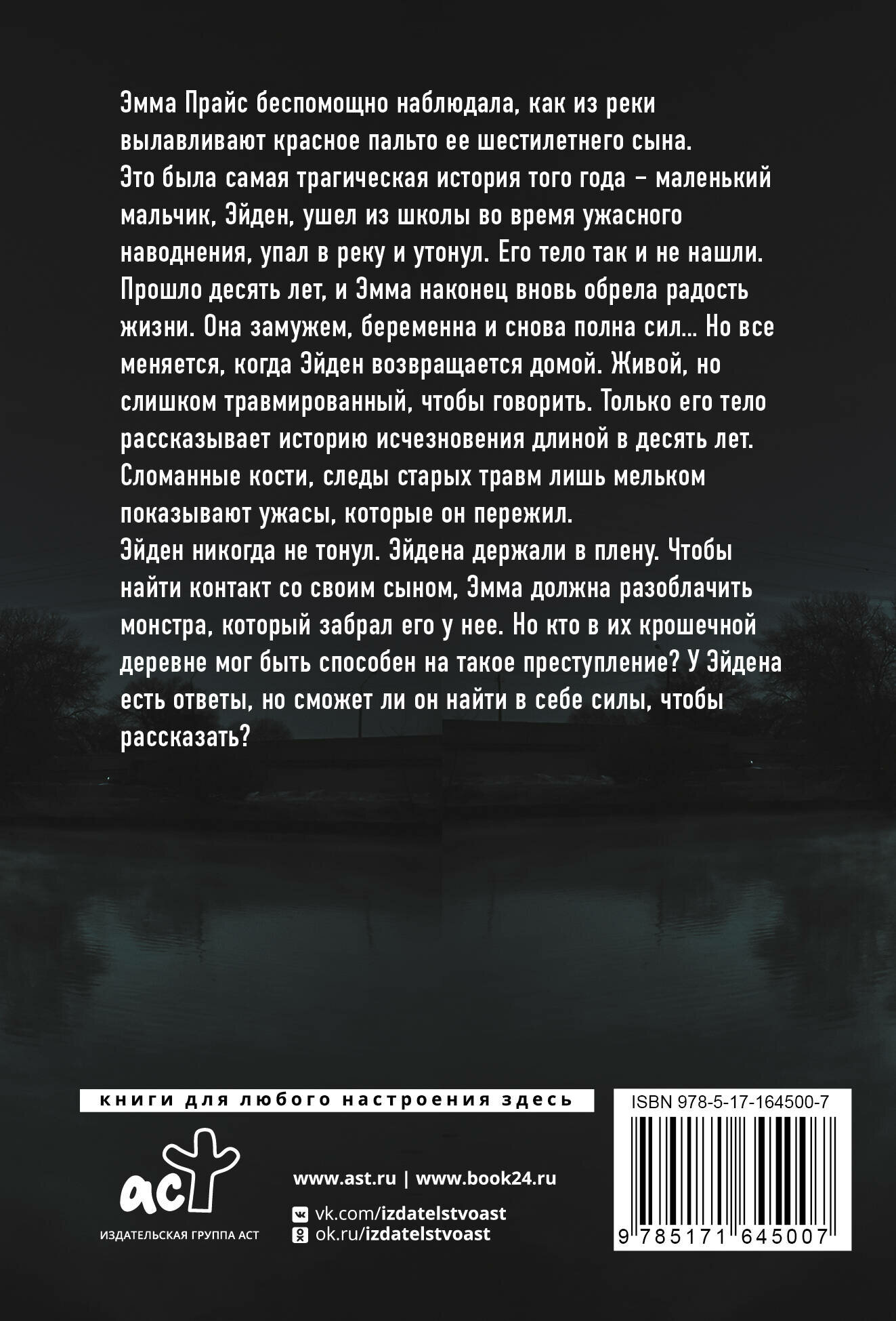 Эмма Прайс беспомощно наблюдала, как из реки вылавливают красное пальто ее шестилетнего сына. Это была самая трагическая история того года – маленький мальчик, Эйден, ушел из школы во время ужасного наводнения, упал в реку и утонул. Его тело так и не нашли. Прошло десять лет, и Эмма наконец вновь обрела радость жизни. Она замужем, беременна и снова полна сил… Но все меняется, когда Эйден возвращается домой. Живой, но слишком травмированный, чтобы говорить. Только его тело рассказывает историю исчезновения длиной в десять лет. Сломанные кости, следы старых травм лишь мельком показывают ужасы, которые он пережил. Эйден никогда не тонул. Эйдена держали в плену. Чтобы найти контакт со своим сыном, Эмма должна разоблачить монстра, который забрал его у нее. Но кто в их крошечной деревне мог быть способен на такое преступление? У Эйдена есть ответы, но сможет ли он найти в себе силы, чтобы рассказать?