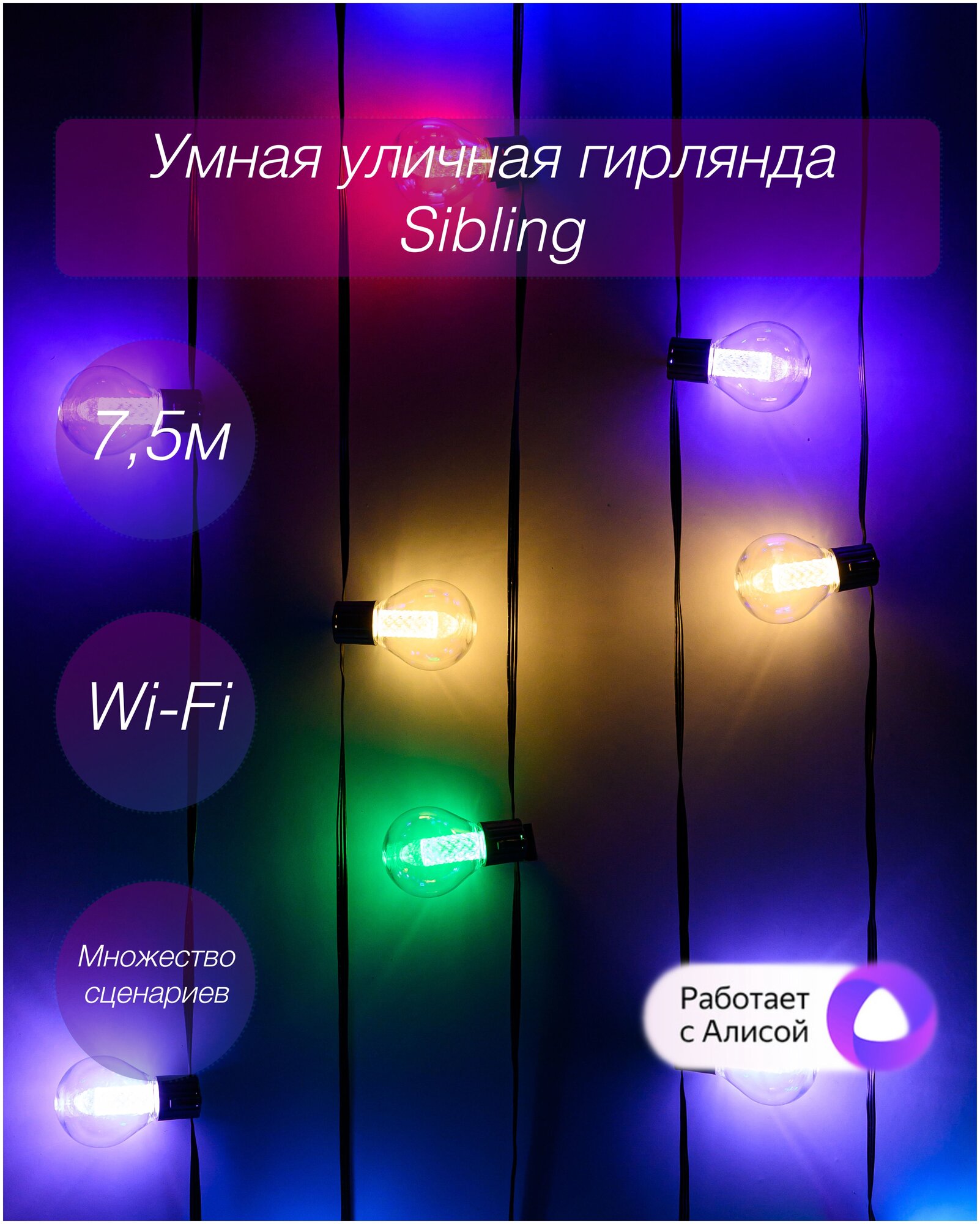 Умная электрогирлянда Sibling , 30 LED, 7,5 м, Wi-Fi/Sibling, свечение RGB оптимальна для декоративной подсветки объектов, наружных стен зданий, окон. Изделие можно подключить с помощью модуля Wi-Fi к планшету или смартфону на базе операционных систем Android и iOS.