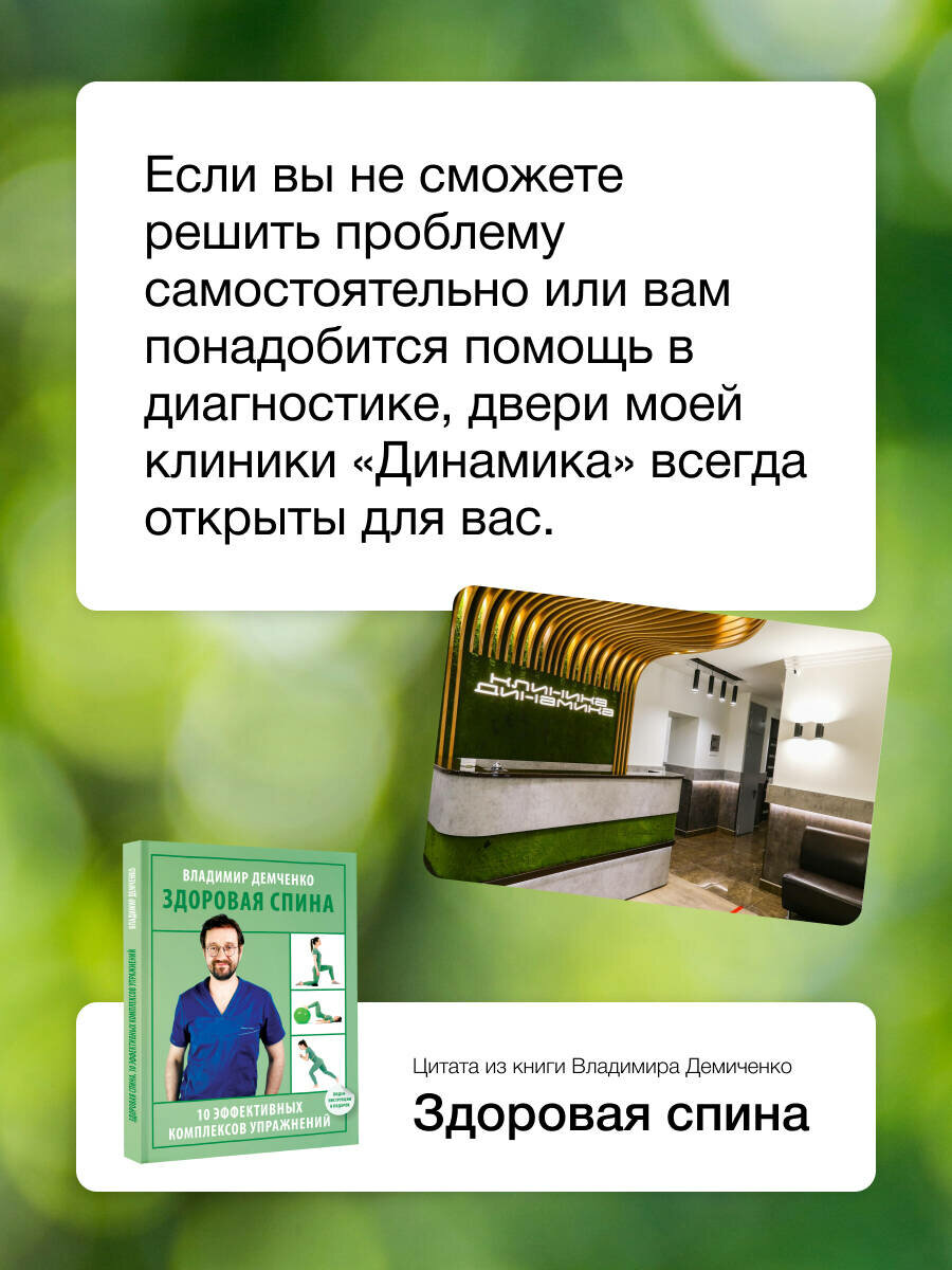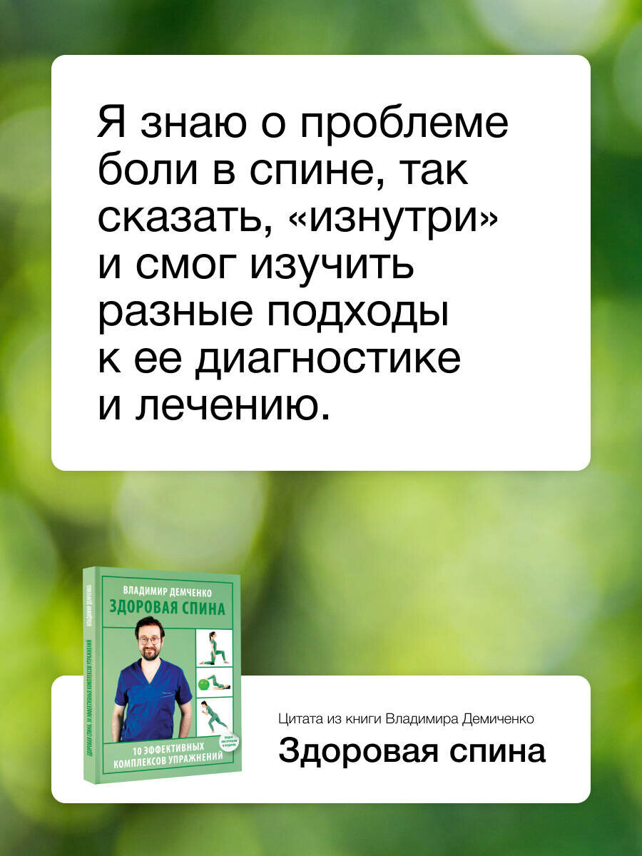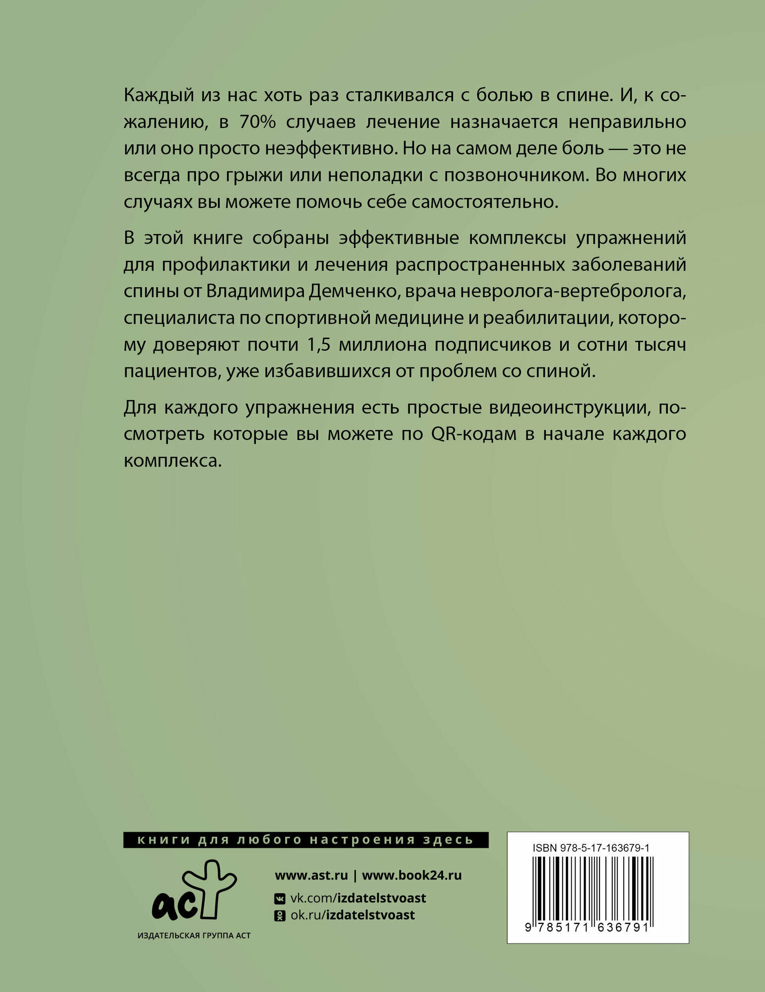 В этой книге собраны эффективные комплексы упражнений для профилактики и лечения распространенных заболеваний спины от Владимира Демченко, врача невролога-вертебролога, специалиста по спортивной медицине и реабилитации, которому доверяют почти 1,5 миллиона подписчиков и сотни тысяч пациентов, уже избавившихся от проблем со спиной.