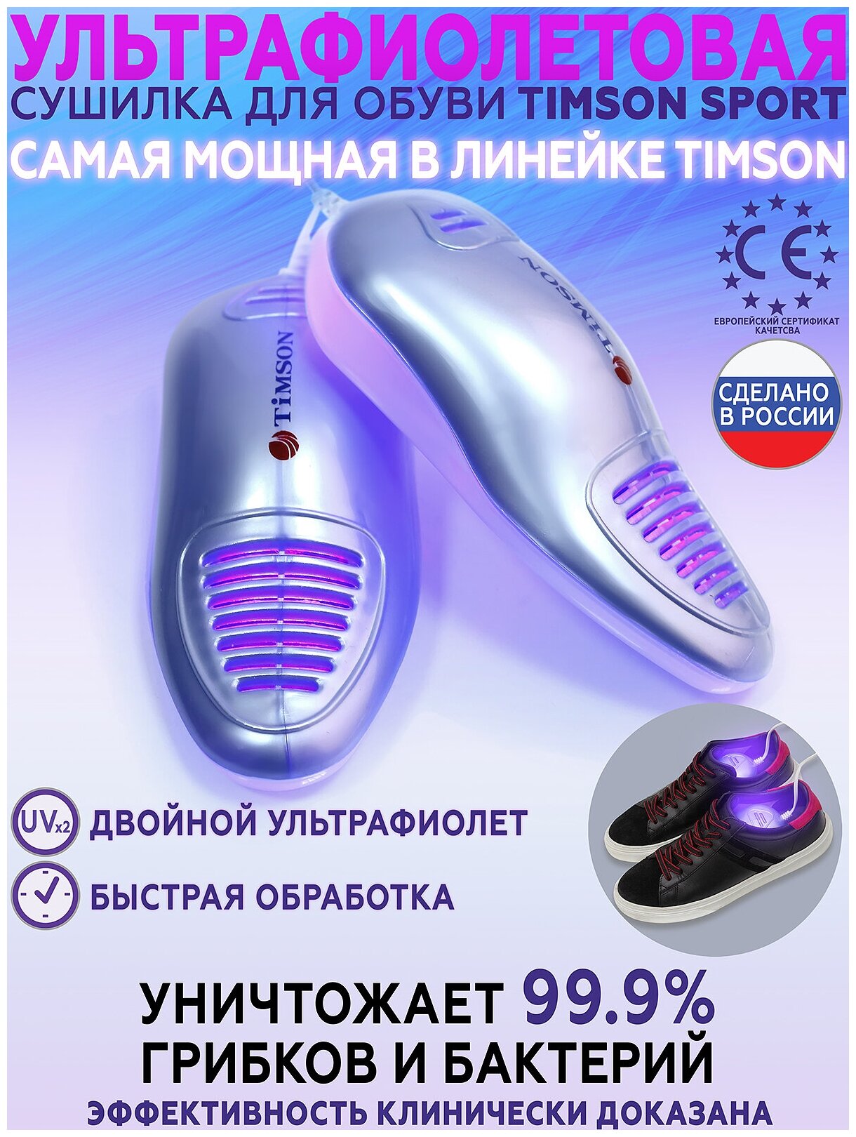 Ультрафиолетовая сушилка для обуви Timson Sport изготавливается из экологически чистого пластика, комплектуется ультрафиолетовыми излучателями и конвекционными окнами, и с помощью ультрафиолетового излучения и тепла способна полностью высушивать и дезинфицировать внутренние поверхности обуви всего за 4–6 часов, а также обеспечивать качественную вентиляцию обуви. Идеально подходит для поддержания формы спортивной обуви (кроссовки, кеды, лыжные ботинки, коньки и т. д.).
