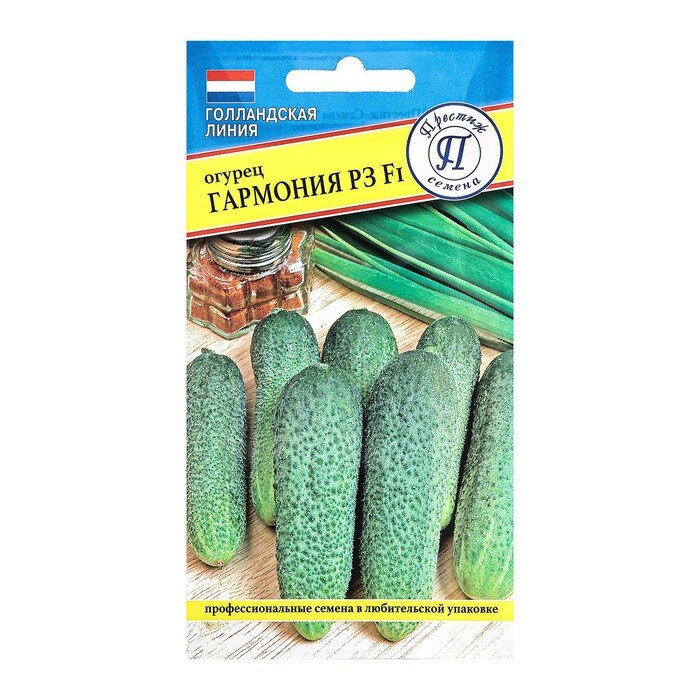 **Семена огурец Гармония РЗ F1** — раннеспелый гибрид, от первых всходов до начала съема овощей проходит 40-42 дней. Рекомендован для защищенного и открытого грунта. Растения плетистые, зеленцы цилиндрические, вес — до 90 г. Поверхность мелкобугорчатая, мякоть хрустящая, сочная, без горечи. Подходят для употребления в пищу в свежем виде и в консервацию. Урожайность составляет до 10 кг с 1 квадратного метра посевов.