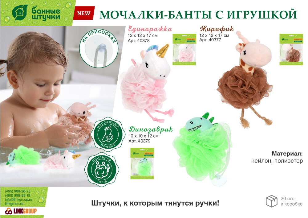 | Особенности | Мочалка-игрушка оснащена присоской для удобства хранения. |