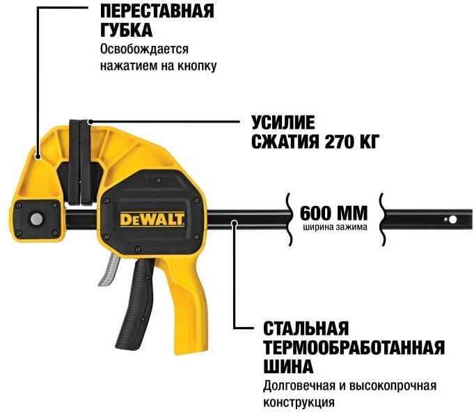 Струбцина DeWALT XL 600мм, давление 270кг