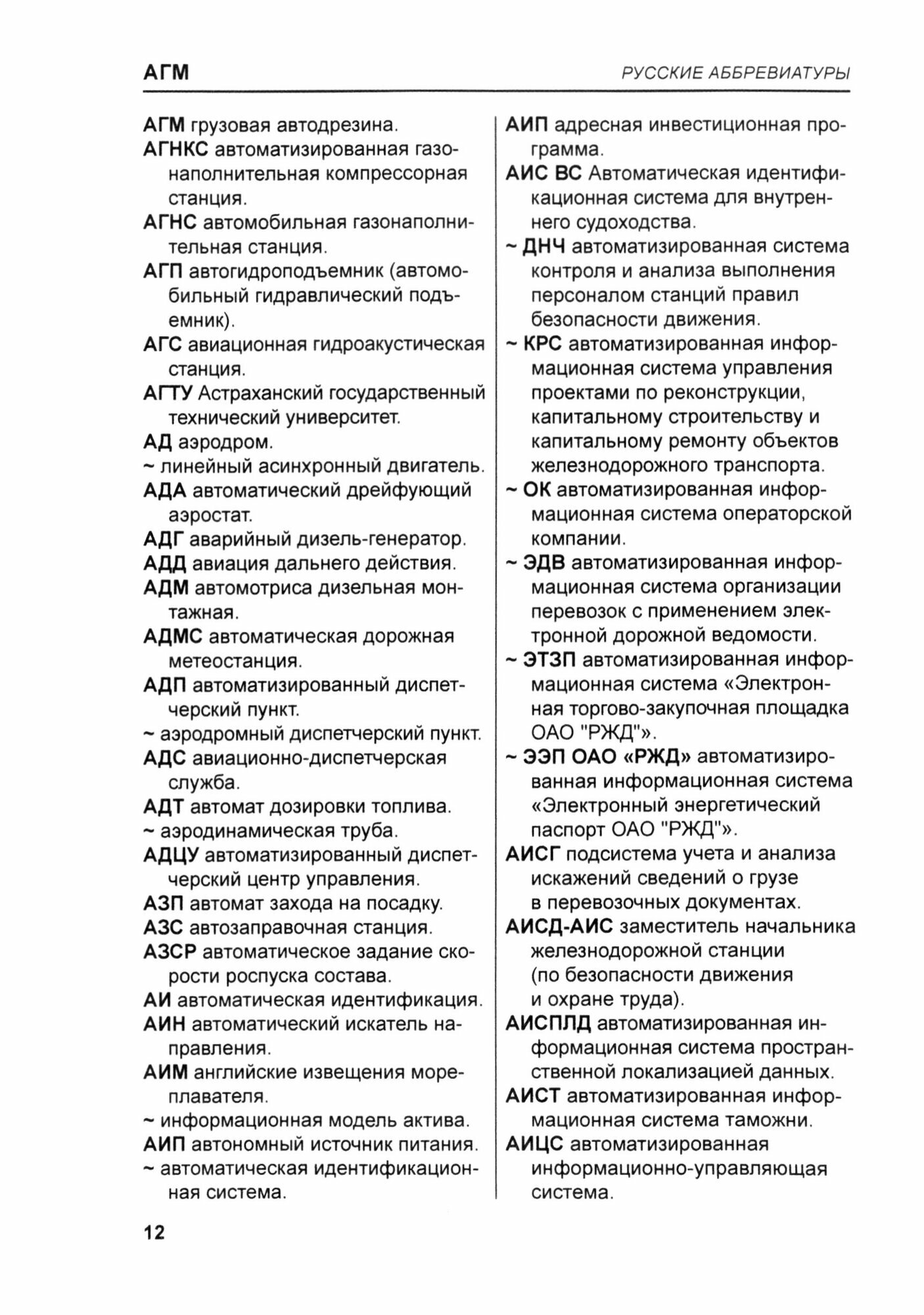 Специальный словарь транспортных аббревиатур - русских (около 4,9 тыс. ед.) и английских (более 5,0 тыс. ед.) - охватывает все виды транспорта (автомобильный, воздушный, водный (включая морской и речной), железнодорожный, трубопроводный) во всех аспектах их создания и функционирования: изыскания, проектирование, эксплуатация, развитие, а также смежные вопросы: экономика, информационное обеспечение, взаимодействие видов транспорта и т. д. Материал словаря может быть полезен широкому кругу специалистов магистральных видов транспорта в качестве справочника и как методическое пособие при формировании новых аббревиатур в текстах соответствующей тематики.