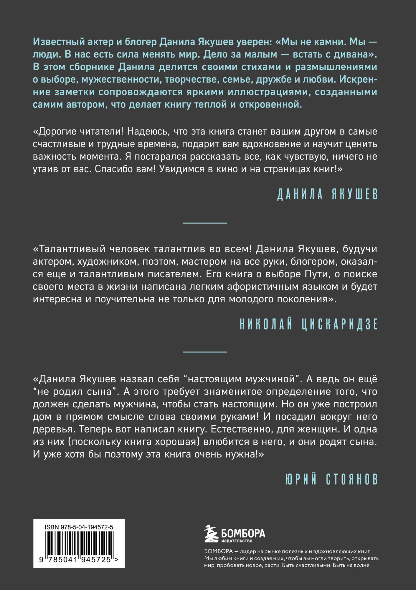 Известный актер и блогер Данила Якушев уверен: "Мы не камни. Мы — люди. В нас есть сила менять мир. Дело за малым — встать с дивана". В этом сборнике Данила делится своими стихами и размышлениями о выборе, мужественности, творчестве, семье, дружбе и любви. Искренние заметки сопровождаются яркими иллюстрациями, созданными самим автором, что делает книгу теплой и откровенной. "Дорогие читатели! Надеюсь, что эта книга станет вашим другом в самые счастливые и трудные времена, подарит вам вдохновение и научит ценить важность момента. Я постарался рассказать все как чувствую, ничего не утаив от вас. Спасибо вам! Увидимся в кино и на страницах книг!" Данила Якушев