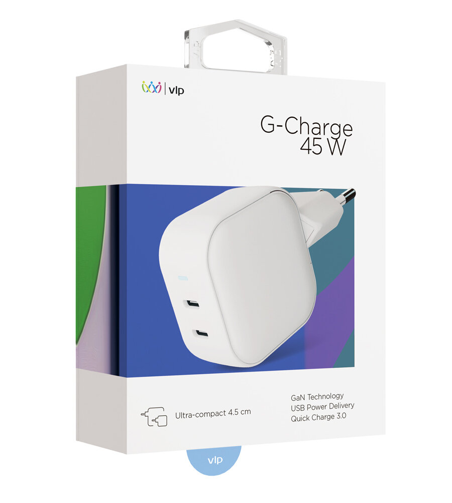 VLP G-Charge - современное сетевое зарядное устройство с пиковой мощностью 45 Вт. В основе работы устройства лежит технология GaN. Зарядное устройство оснащено двумя портами USB-C позволяет заряжать до двух устройств одновременно без потери мощности.