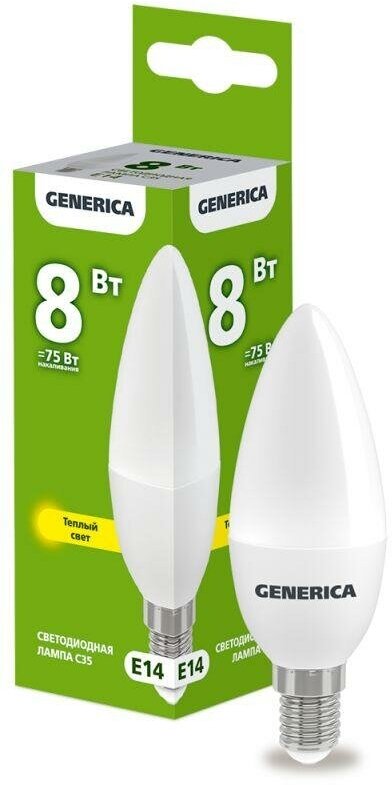 Лампа светодиодная GENERICA C35 8Вт свеча 3000К E14 230В LL-C35-08-230-30-E14-G