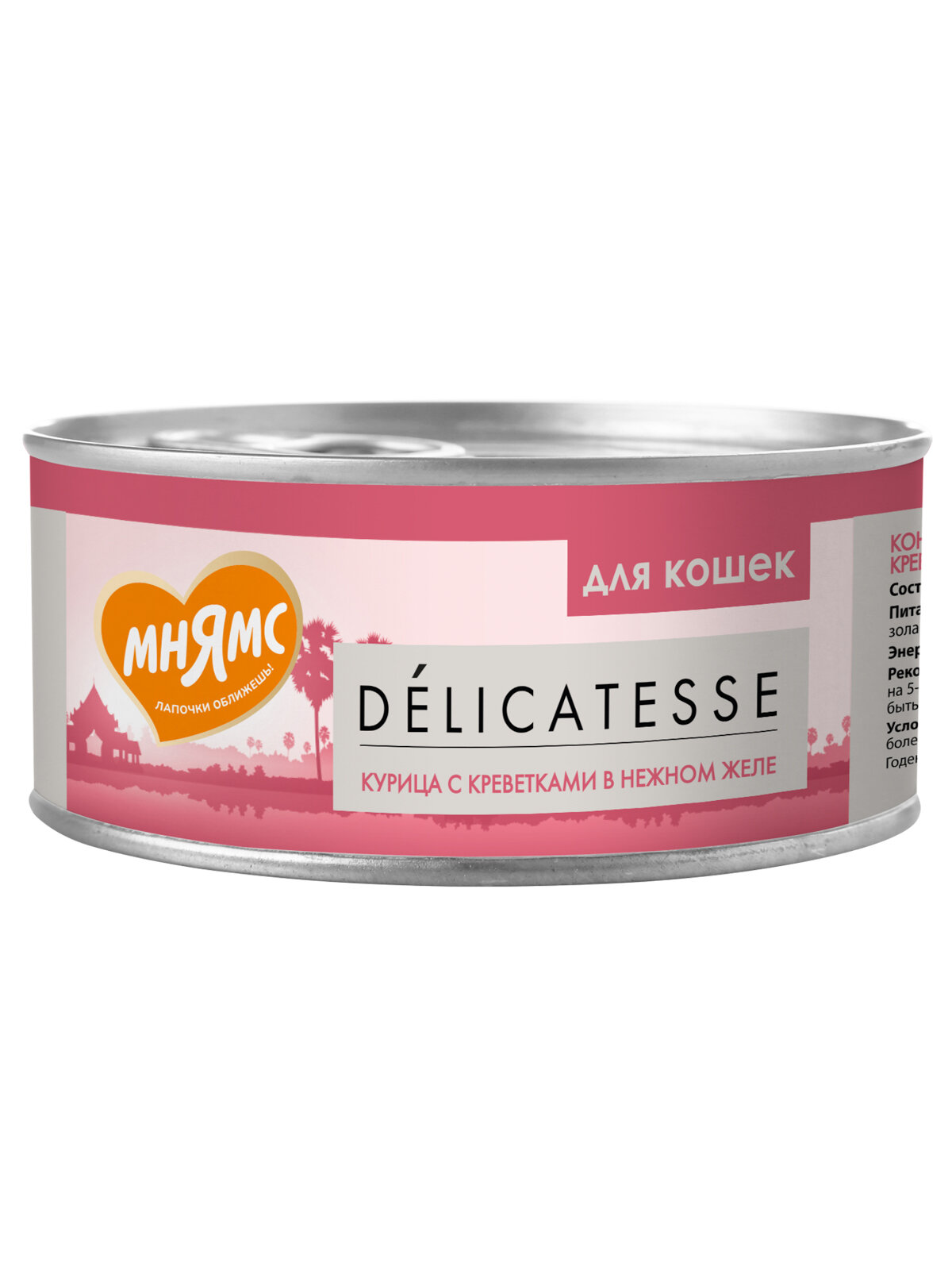Мнямс консервы для кошек курица с креветками в нежном желе 70 г Консервы для кошек «Мнямс» состоят исключительно из отборных натуральных компонентов и не содержат сою, искусственные красители и усилители вкуса. В процессе производства консервов используется только отборное парное и охлажденное, а не замороженное сырье.