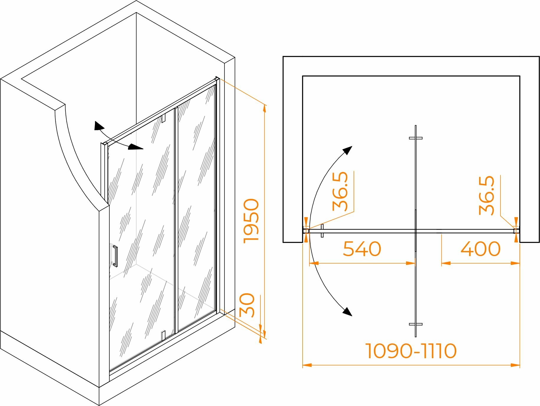 - Размеры с диапазоном регулировок (ШхВ): 1090-1110х1950 мм.