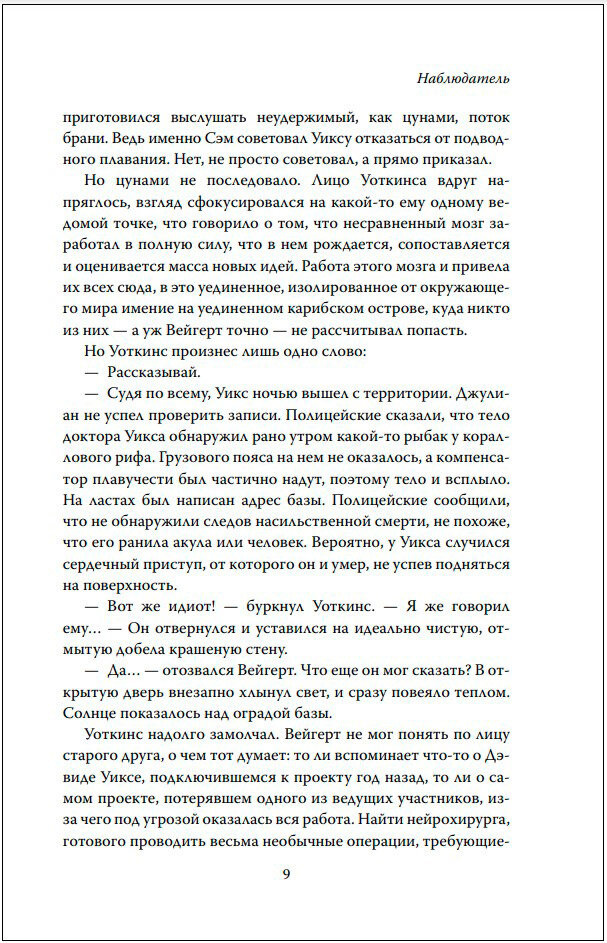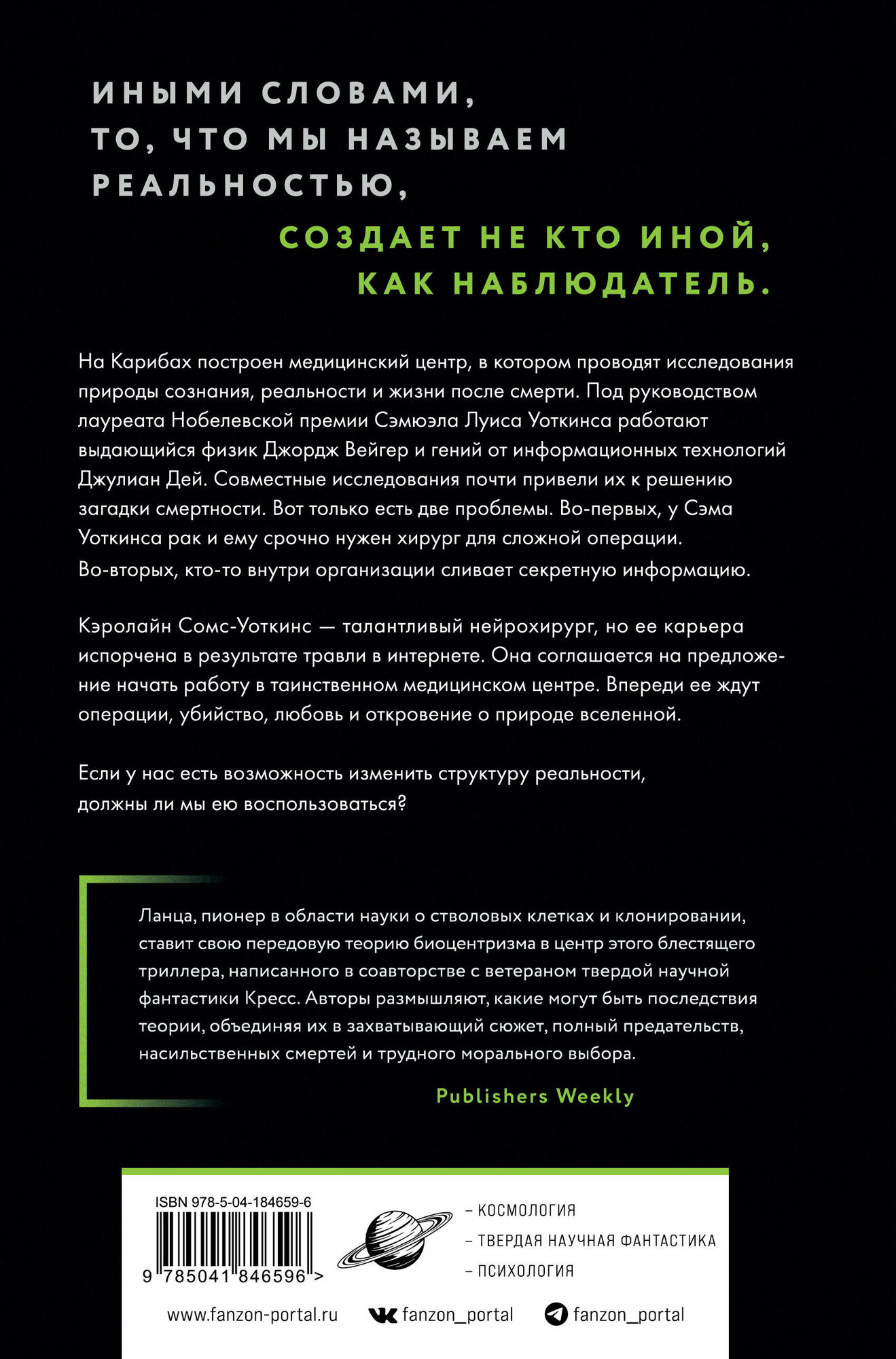 Если у нас есть возможность изменить структуру реальности, должны ли мы ею воспользоваться? На Карибах построен медицинский центр, в котором проводят исследования природы сознания, реальности и жизни после смерти. Под руководством лауреата Нобелевской премии Сэмюэла Луиса Уоткинса работают выдающийся физик Джордж Вейгер и гений от информационных технологий Джулиан Дей. Совместные исследования почти привели их к решению загадки смертности. Вот только есть две проблемы. Во-первых, у Сэма Уоткинса рак и ему срочно нужен хирург для сложной операции. Во-вторых, кто-то внутри организации сливает секретную информацию. Кэролайн Сомс-Уоткинс - талантливый нейрохирург, но ее карьера испорчена в результате травли в интернете. Она соглашается на предложение начать работу в таинственном медицинском центре. Впереди ее ждут операции, убийство, любовь и откровение о природе вселенной. «Наблюдатель» - это расширяющее кругозор путешествие к самым дальним горизонтам современной науки, которое заставит вас задуматься о жизни и том, какие поразительные возможности открывает перед нами сила воображения. «Нэнси Кресс - одна из величайших из ныне живущих писателей-фантастов, и ее особый талант рассказывать истории о людях, находящихся на передовой науки, открывающих что-то новое и чудесное, идеально соответствует идеям, которые пришли к Роберту Ланце в ходе его научных исследований. Вместе они создали поразительную и увлекательную историю». - Ким Стэнли Робинсон «Эта восхитительная история перенесет вас глубоко в квантовую физику, где сложные концепции освещаются через захватывающую и трогательную историю». - Ронда Берн «Ланца, пионер в области науки о стволовых клетках и клонировании, ставит свою передовую теорию биоцентризма в центр этого блестящего триллера, написанного в соавторстве с ветераном научной фантастики Кресс. Авторы размышляют, какие могут быть последствия теории, объединяя их в захватывающий сюжет, полный предательств, насильственных смертей и трудного морального выбора».?Publishers Weekly «Умопомрачительный. Роман, полный жизнеутверждающих идей, который, вероятно, заставит читателей переосмыслить концепции времени и пространства. Художественное исследование важных вопросов, над которыми начинаешь размышлять». - Kirkus Reviews «Главный герой - блестящий нейрохирург, неохотно втянутый в секретный научный проект, призванный доказать, что общепринятый взгляд на реальность может быть совершенно неверен. Захватывающая история, наполненная правдоподобными персонажами».? The Guardian «Нэнси Кресс - искусный рассказчик, и ее эмпатия чувствуется на каждой странице. Даже когда мы вступаем на сумасшедшую территорию квантовой физики и природы реальности, принадлежащую Роберту Ланца, мы никогда не теряем из виду Каро, блестящего нейрохирурга, которая делает все возможное, чтобы защитить близких людей. Этот роман - лучшее из науки и фантастики, интеллектуальное приключение с искренним сердцем». - Дэрил Грегори «Обнадеживающий, вдохновляющий, душераздирающий и согревающий, приводящий в ярость и воодушевляющий, этот роман появился в результате плодотворного сотрудничества двух прекрасных авторов с пониманием твердой науки и талантом к научно-фантастическому повествованию».? NetGalley/Goodreads
