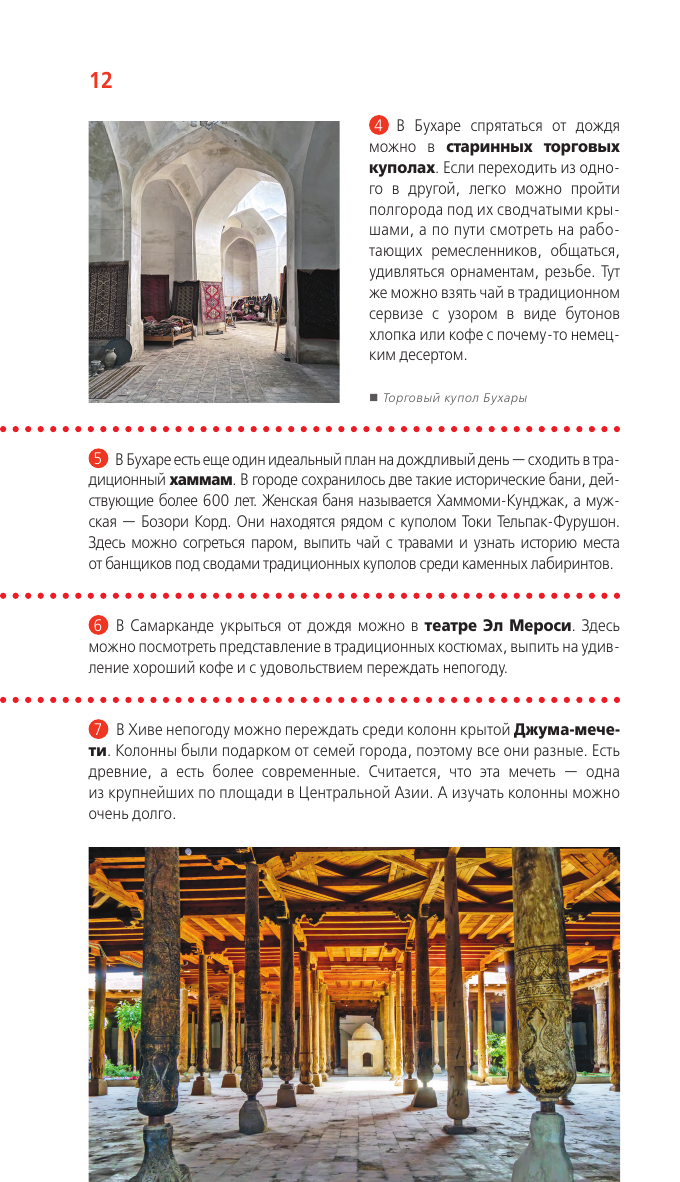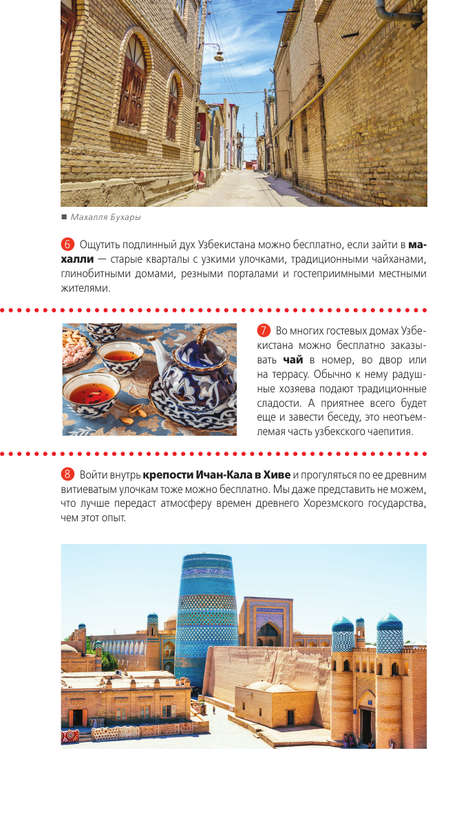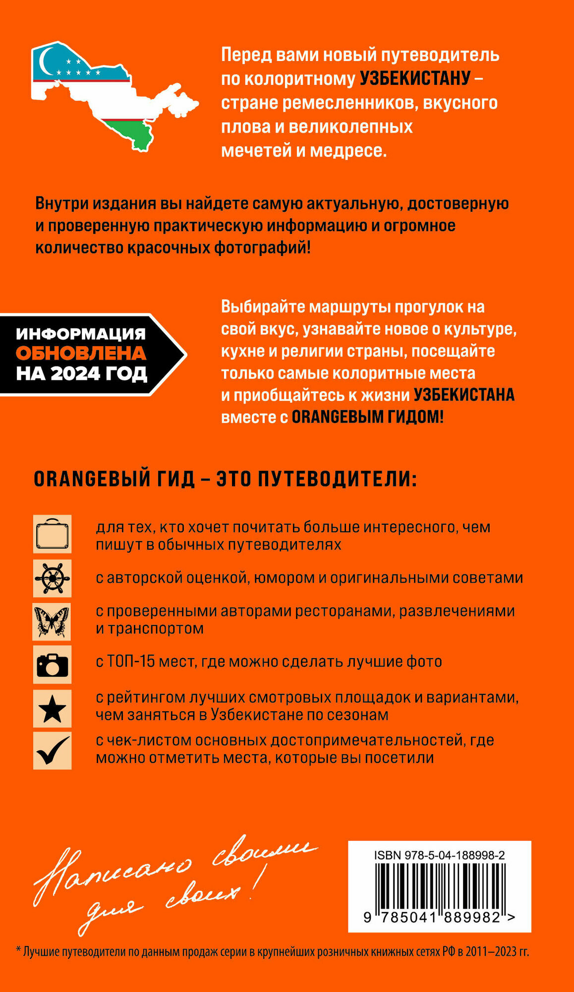 Многовековая история, древние города, через которые проходил Великий шелковый путь, восточный колорит, богатая культура и вкусная еда - все это Узбекистан! Отправляйтесь в незабываемое путешествие по стране вместе с нашим Оранжевым гидом! В нем содержится актуальная и полезная информация о главных городах страны, различные маршруты на любой вкус, подсказки, что делать, если идет дождь, или где искать лучшие смотровые площадки, а также множество полезных советов от авторов Екатерины Поляковой и Никиты Здоровенина, основателей образовательного проекта "Города & Люди". Вас ждут прогулки по самым ярким городам Узбекистана: Ташкенту, Самарканду, Бухаре, Хиве, Коканду и Маргилану. Сориентироваться на местности помогут удобные карты, расположенные на страницах путеводителя. Вся информация актуальна на 2024 год.