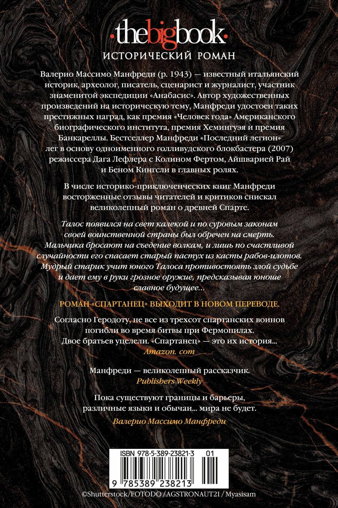 Валерио Массимо Манфреди (р. 1943) — известный итальянский историк, археолог, писатель, сценарист и журналист, участник знаменитой экспедиции «Анабасис». Автор художественных произведений на историческую тему, Манфреди удостоен таких престижных наград, как премия «Человек года» Американского биографического института, премия Хемингуэя и премия Банкареллы. Бестселлер Манфреди «Последний легион» лег в основу одноименного голливудского блокбастера (2007) режиссера Дага Лефлера с Колином Фертом, Айшварией Рай и Беном Кингсли в главных ролях. В числе историко-приключенческих книг Манфреди восторженные отзывы читателей и критиков снискал великолепный роман о Древней Спарте. Талос появился на свет калекой и по суровым законам своей воинственной страны был обречен на смерть. Мальчика бросают на съедение волкам, и лишь по счастливой случайности его спасает старый пастух из касты рабов-илотов. Мудрый старик учит юного Талоса противостоять злой судьбе и дает ему в руки грозное оружие, предсказывая юноше славное будущее... Роман «Спартанец» выходит в новом переводе.