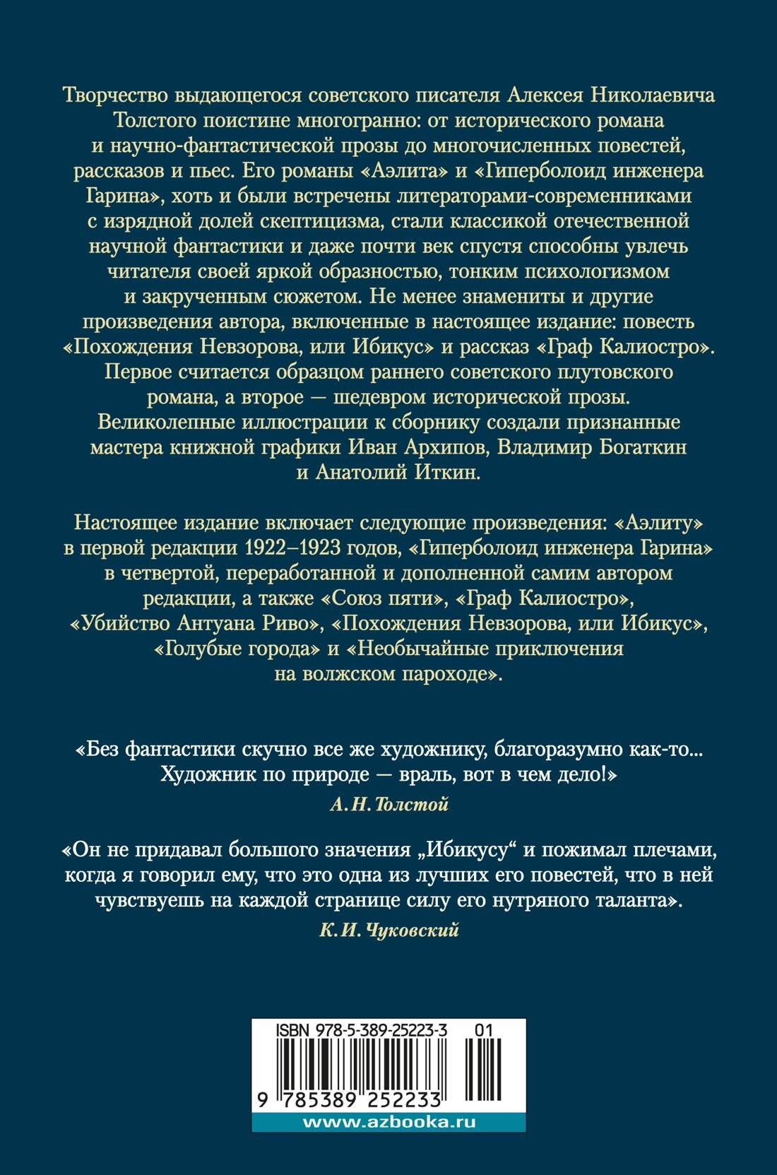 Творчество выдающегося советского писателя Алексея Николаевича Толстого поистине многогранно: от исторического романа и научно-фантастической прозы до многочисленных повестей, рассказов и пьес. Его романы «Аэлита» и «Гиперболоид инженера Гарина», хоть и были встречены литераторами-современниками с изрядной долей скептицизма, стали классикой отечественной научной фантастики и даже почти век спустя способны увлечь читателя своей яркой образностью, тонким психологизмом и закрученным сюжетом. Не менее знамениты и другие произведения автора, включенные в настоящее издание: повесть «Похождения Невзорова, или Ибикус» и рассказ «Граф Калиостро». Первое считается образцом раннего советского плутовского романа, а второе — шедевром исторической прозы. В сборник также вошли: «Союз пяти», «Убийство Антуана Риво», «Голубые города» и «Необычайные приключения на волжском пароходе». Великолепные иллюстрации к сборнику создали признанные мастера книжной графики Иван Архипов, Владимир Богаткин и Анатолий Иткин.