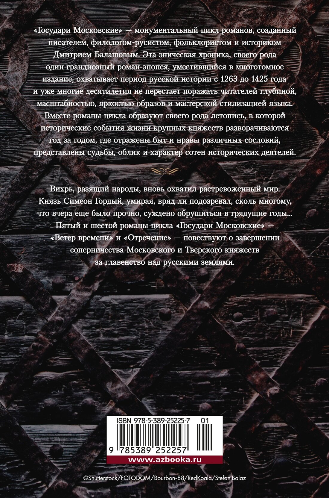 «Государи Московские» — монументальный цикл романов, созданный писателем, филологом-русистом, фольклористом и историком Дмитрием Балашовым. Эта эпическая хроника, своего рода один грандиозный роман-эпопея, уместившийся в многотомное издание, охватывает период русской истории с 1263 до 1425 года и уже многие десятилетия не перестает поражать читателей глубиной, масштабностью, яркостью образов и мастерской стилизацией языка. Вместе романы цикла образуют своего рода летопись, в которой исторические события жизни крупных княжеств разворачиваются год за годом, где отражены быт и нравы различных сословий, представлены судьбы, облик и характер сотен исторических деятелей. Вихрь, разящий народы, вновь охватил растревоженный мир. Князь Симеон Гордый, умирая, вряд ли подозревал, сколь многому, что вчера еще было прочно, суждено обрушиться в грядущие годы… Пятый и шестой романы цикла «Государи Московские» — «Ветер времени» и «Отречение» — повествуют о завершении соперничества Московского и Тверского княжеств за главенство над русскими землями.