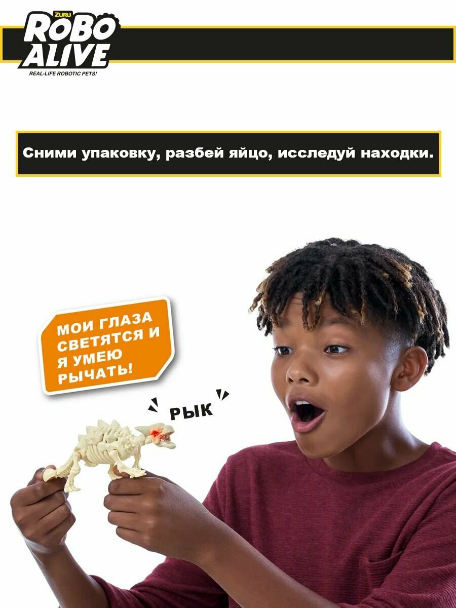 С Robo Alive Dino Fossil Find вас ждут незабываемые приключения! Исследуйте удивительные находки и почувствуйте себя настоящим археологом. Копайтесь в песке и слизи, используя инструмент для раскопок, чтобы найти 1 из 4 окаменелостей динозавра. Грозный Ти-Рекс, ужасающий Трицератопс, потрясающий Анкилозавр или поразительный Стегозавр? Кто попадётся вам? Соберите все части окаменелостей, чтобы оживить скелет! Светящиеся глаза и реалистичный рёв — этот динозавр точно не похож на тех, кого вы видели раньше.