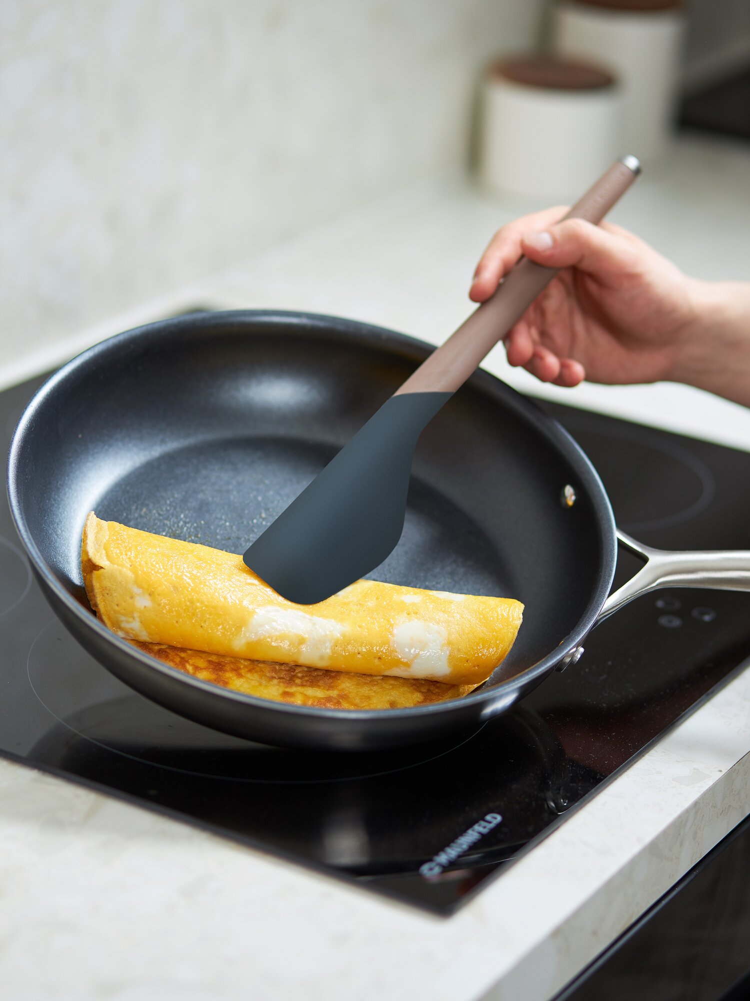 - Лопатка для переворачивания имеет специальный изгиб и заостренный край для быстрого и легкого подхватывания продуктов.